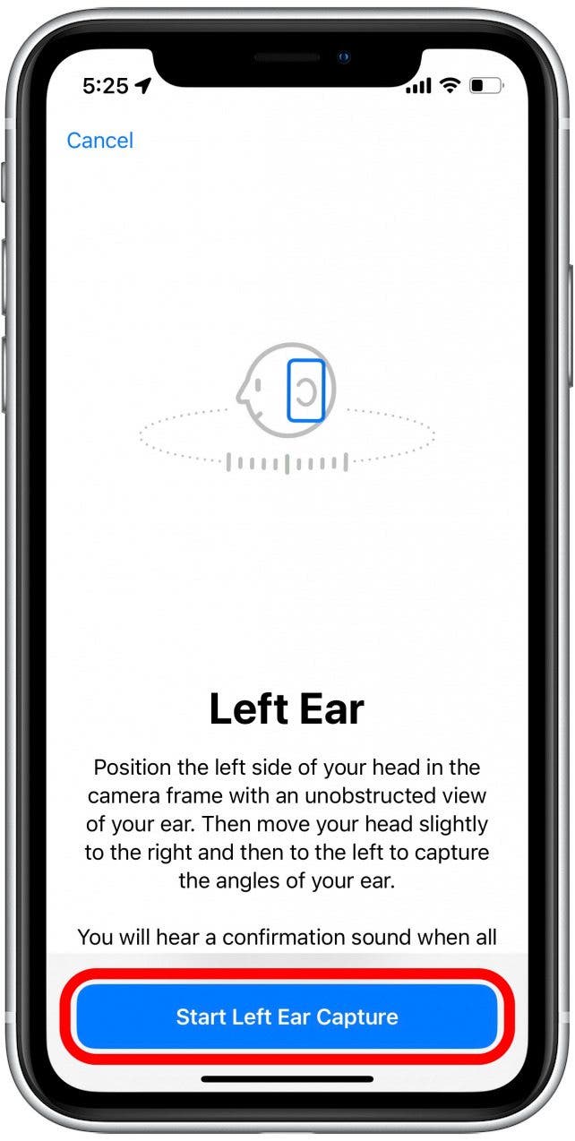 - 接下来,系统将指示您扫描每只耳朵。如果您将手机放在距头部约一臂的距离处,此方法效果最佳。然后,您需要将摄像头对准您的耳朵,并慢慢转动头部,以便摄像头扫描您耳朵的各个角度。轻敲开始左/右耳捕捉当您正确放置手机时。