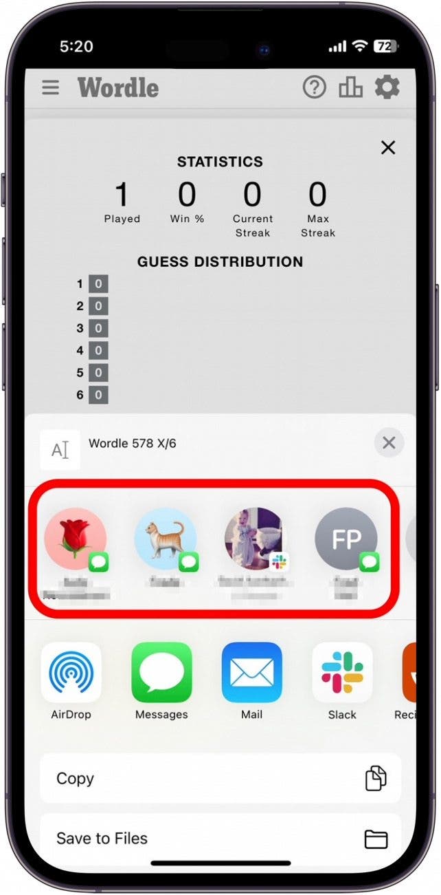 - 玩完 Wordle 游戏后,点击“共享”,然后选择要与之共享分数的应用程序或联系人。