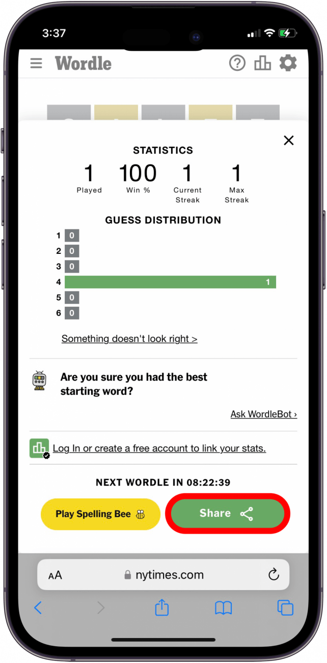 - 当您在 iPhone 或 iPad 上完成 Wordle 游戏后,您将看到一个屏幕,其中显示您的统计数据。轻敲分享。