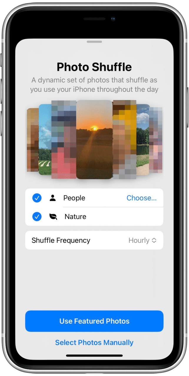 如果您选择自动设置照片随机播放,系统将根据您的喜好为您选择照片。如果您想查看各种各样的照片(包括最近拍摄的照片),这是一个不错的选择。