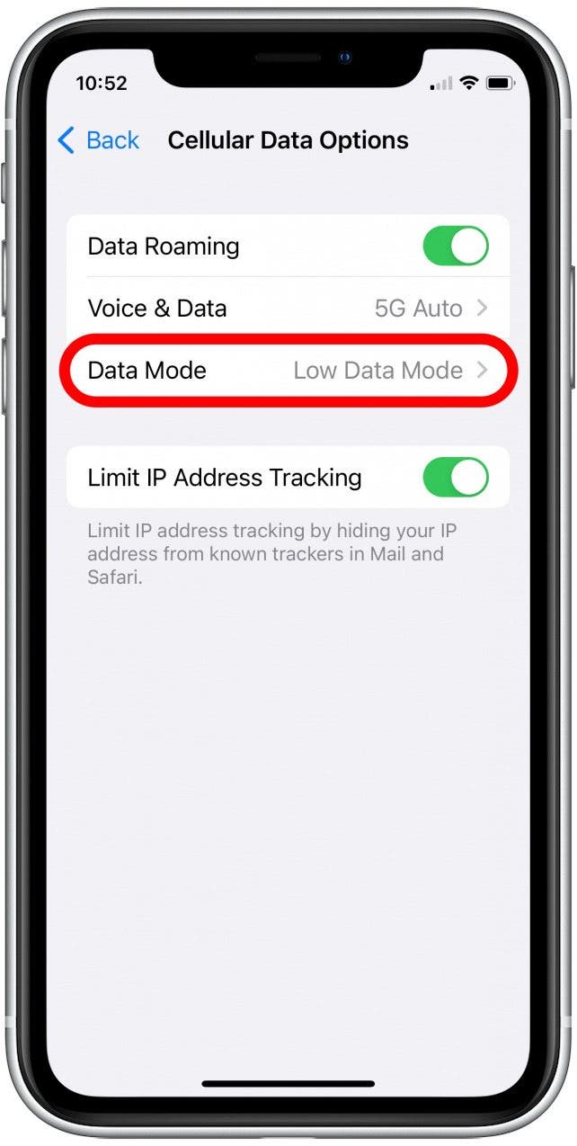 低数据模式是一种设置,可让您通过暂停自动更新和后台任务来减少 iPhone 上应用程序的网络数据使用量(正如我们在上面部分中所做的那样)。不幸的是,虽然低数据模式会暂停这些进程,但它也会将数据使用率设置为较低模式,这可能会导致热点的速度减慢。因此,如果您遇到热点速度慢的问题,请务必检查此模式是否未启用。