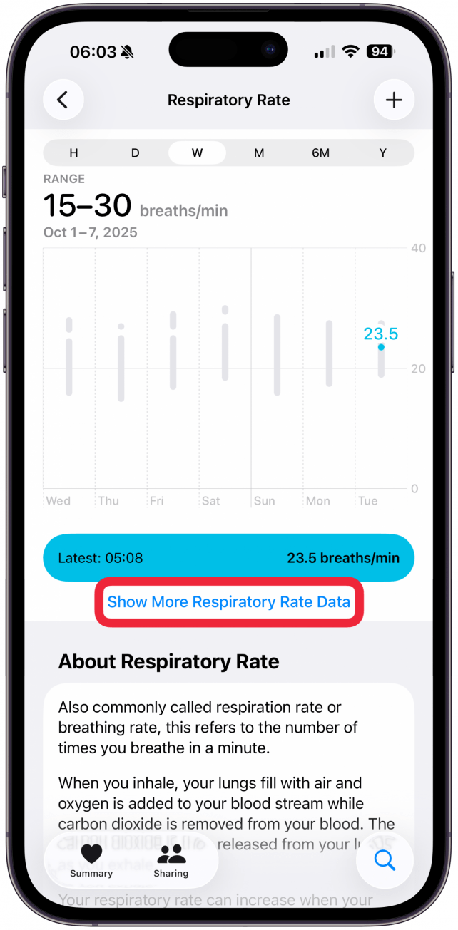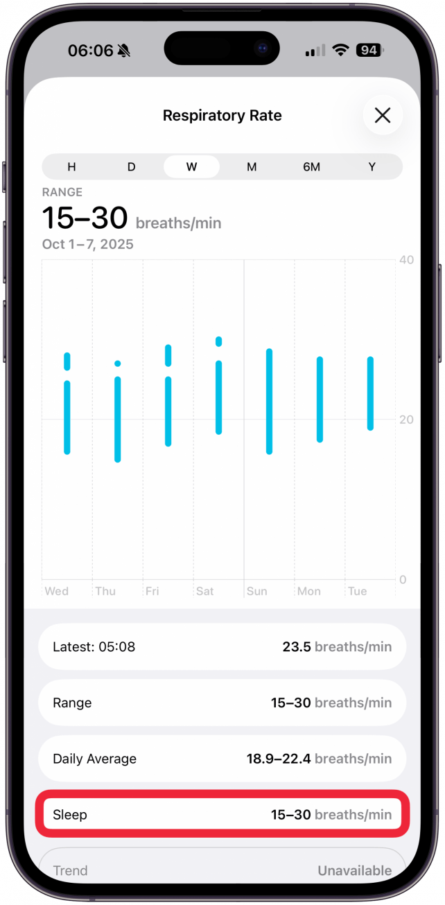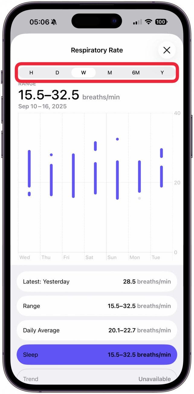 - 在屏幕顶部,您可以选择一个时间范围来查看您的呼吸频率随时间的变化情况,范围从每小时到每年。