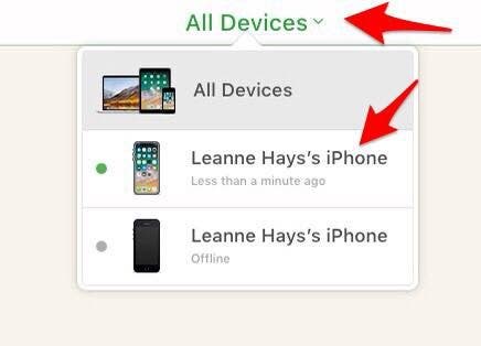 - 点按屏幕顶部的“所有设备”菜单,然后选择您想要禁用“查找我的 iPhone”的设备。