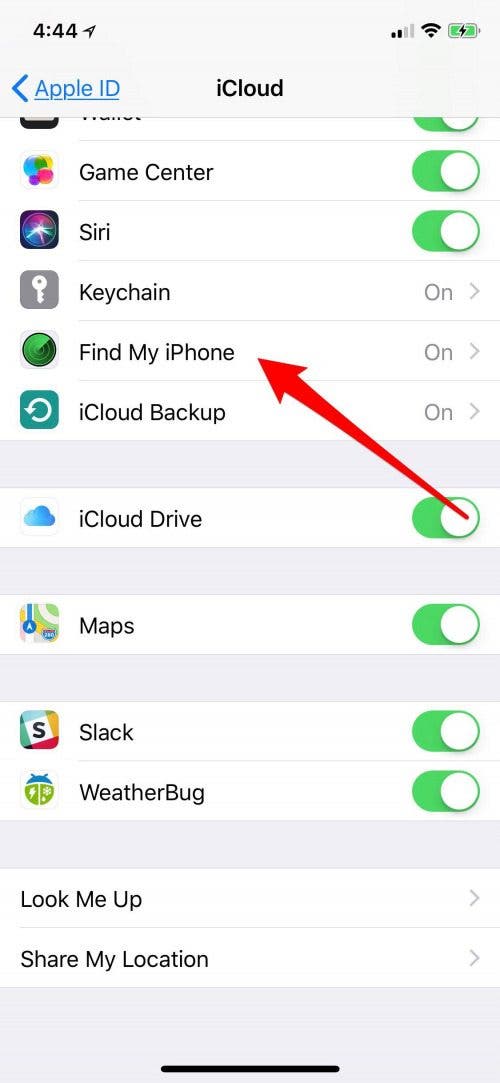 - 向下滚动到“查找我的 iPhone”并点击它。