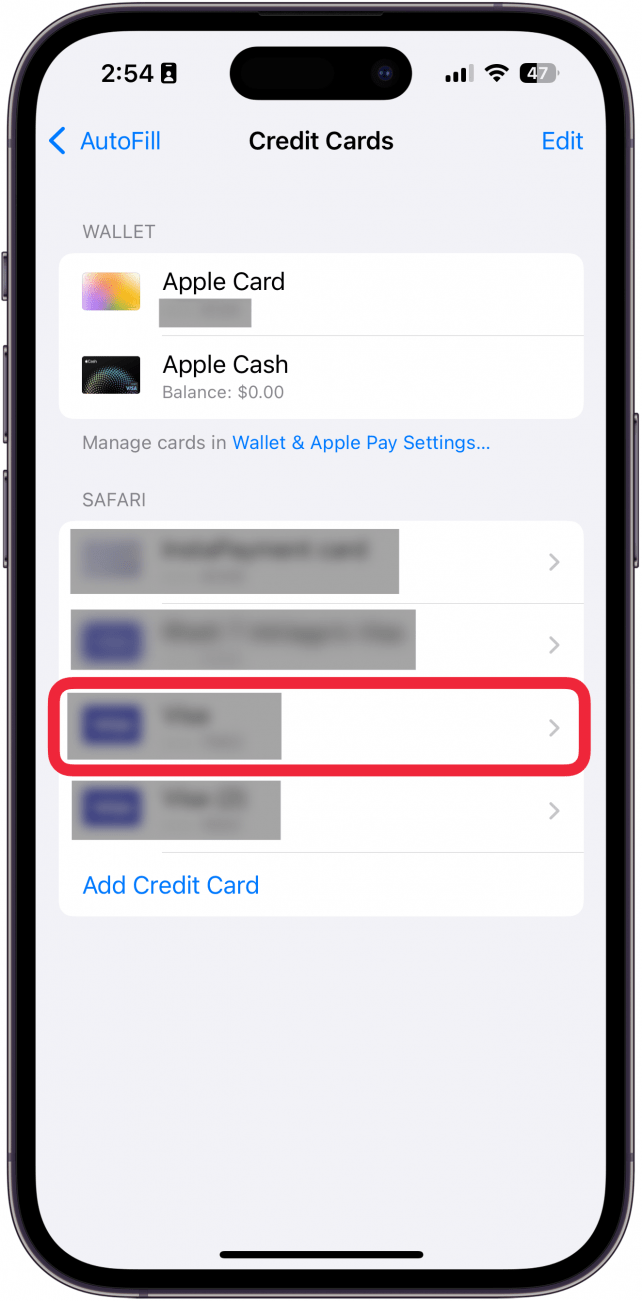 - 如果您想将新卡片添加到自动填充中,请点击添加信用卡。