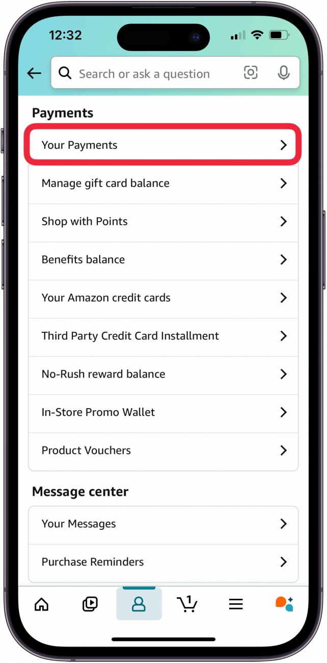 - 打开亚马逊应用程序,然后点击帐户图标在屏幕底部。