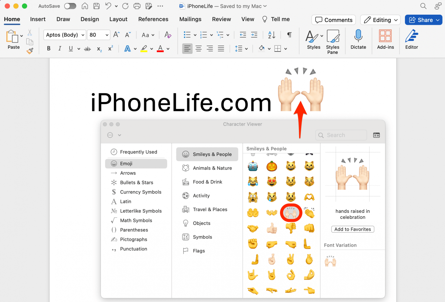 在本节中,我们将向您展示如何在 Mac 上打开表情符号键盘、访问隐藏的全尺寸表情符号菜单以及将表情符号插入 Word 文档。