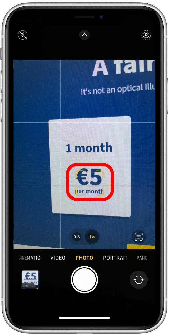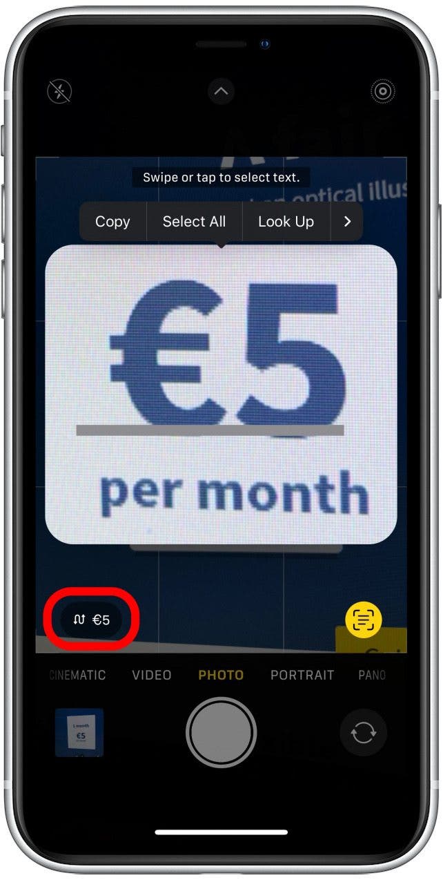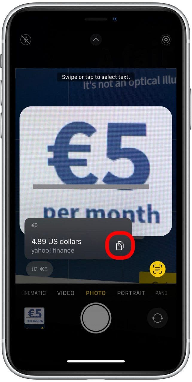 如果您想在不拍照的情况下快速转换货币,请打开相机应用程序并点击货币以使相机聚焦于文本。
