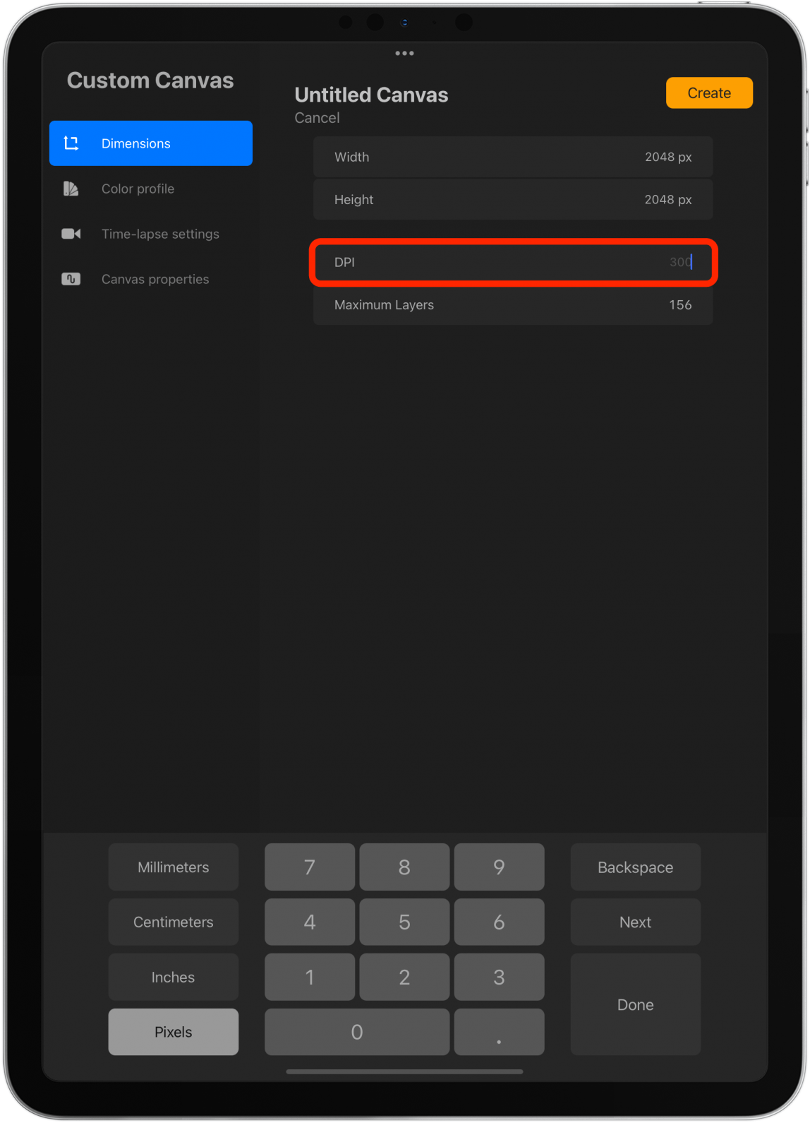 - 接下来,您可以编辑 DPI。 300 是数字艺术的首选 DPI。