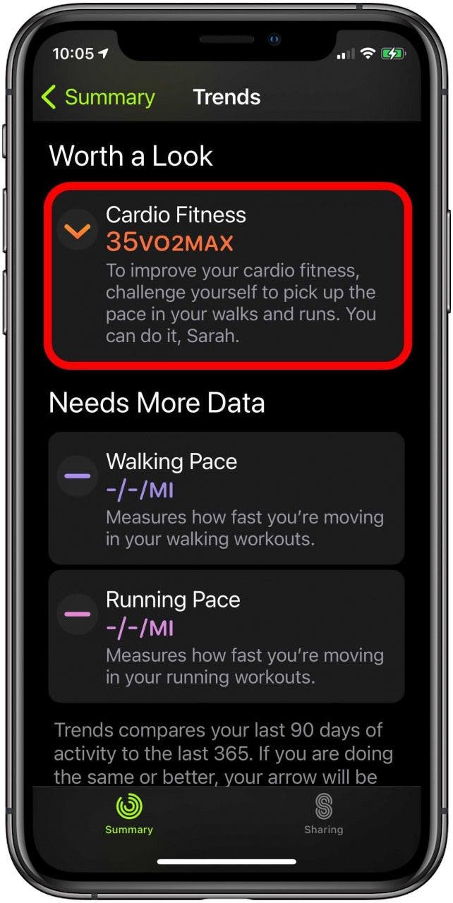 - 返回趋势,向下滚动查找需要更多数据。如果有足够的信息,健身应用程序会在此处列出它可以跟踪和测量的趋势。