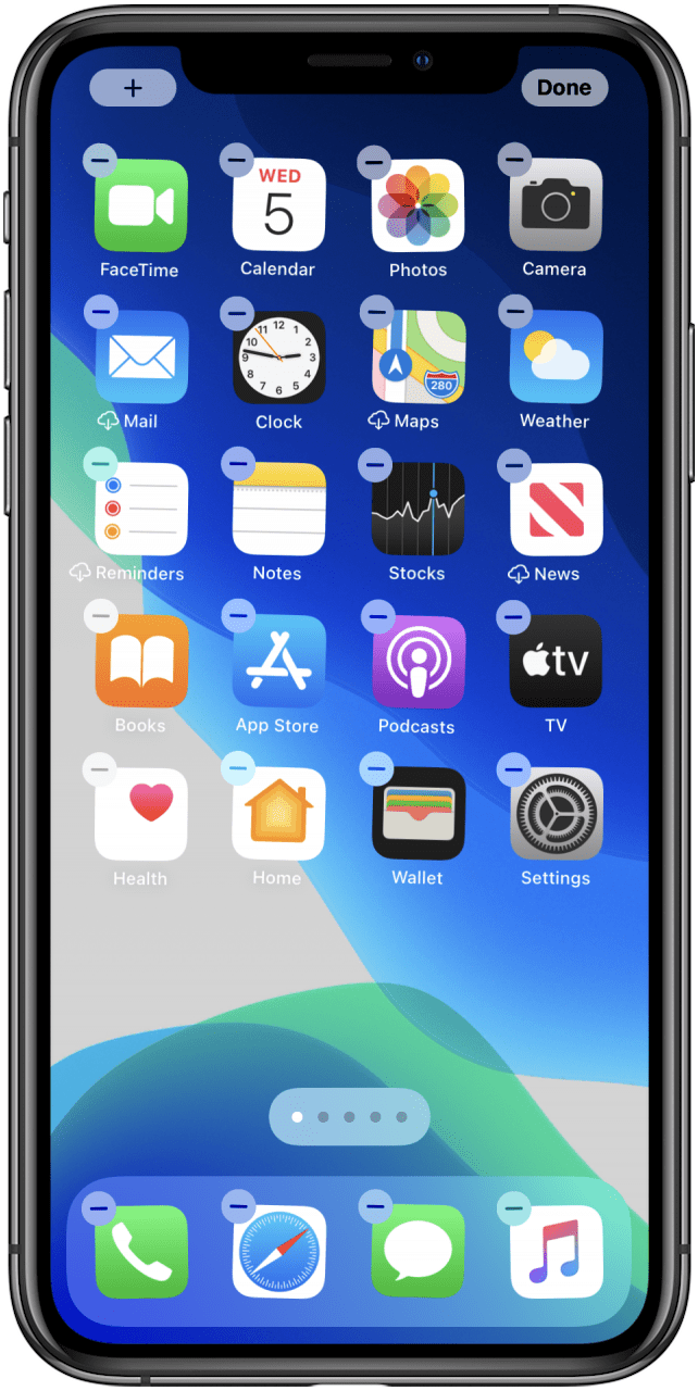 - 长按在 iPhone 主屏幕的空白部分,直到应用程序图标摆动。