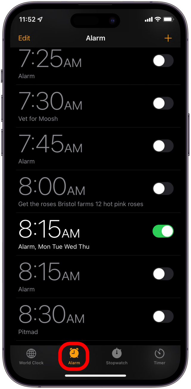 - 轻敲警报,然后确保您为每个闹钟设置了正确的时间,包括上午或下午,并且闹钟已打开(开关将为绿色)。