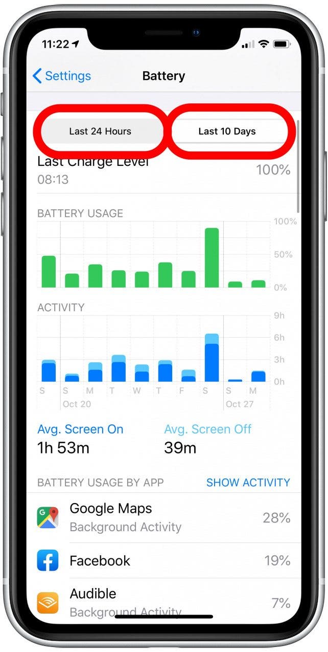 - 向下滚动,您将看到每个应用程序消耗了多少总电池电量。