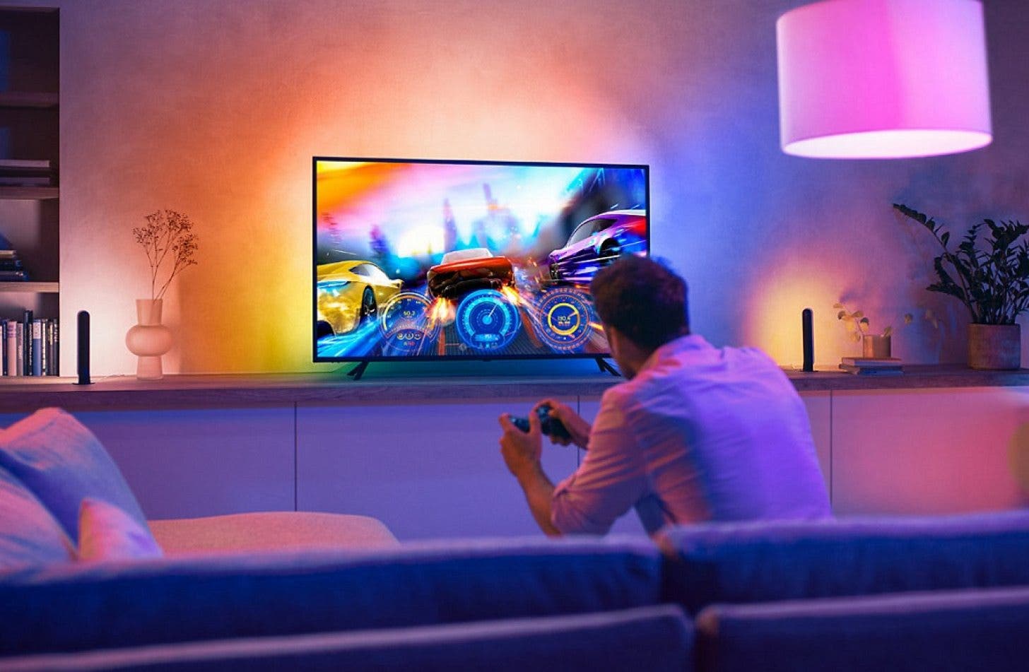 飞利浦目前在 Hue Play 系列中提供多种产品。最近添加的功能是坚固的多色灯带,适当命名为飞利浦 Hue Play 渐变灯带(199 美元)。根据电视的屏幕尺寸,渐变条有三种不同的尺寸可供选择,渐变条通过灯条包装中包含的粘合支架连接到电视机的背面。与 Hue 的标准光带不同,Play Gradient 变体是一种厚实的橡胶状,几乎像蛇一样的野兽,旨在承受多个小时的多色明亮光响应。我花了大约 20 分钟来测量、安装并将灯带正确地穿在电视背面,这样一旦电视正确安装在墙上,它就可以很好地隐藏起来。如果您打算这样做,我建议电视后面的墙上有一个四插头电源板,以容纳额外的电气组件。它还需要一些努力,用尼龙搭扣带或胶带将相当大的灯带电源块隐藏在电视后面。