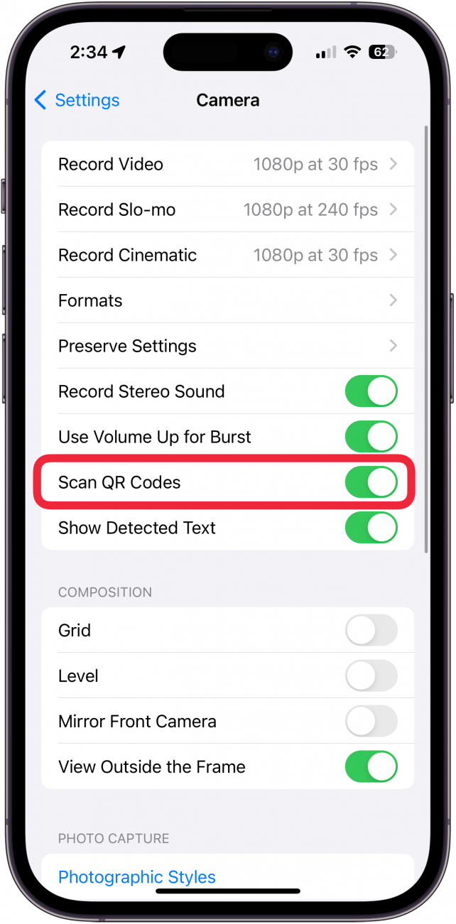 为了扫描 QR 码并使用这个方便的功能,您需要确保打开允许相机扫描 QR 码的设置。检查扫描二维码设置的方法如下: