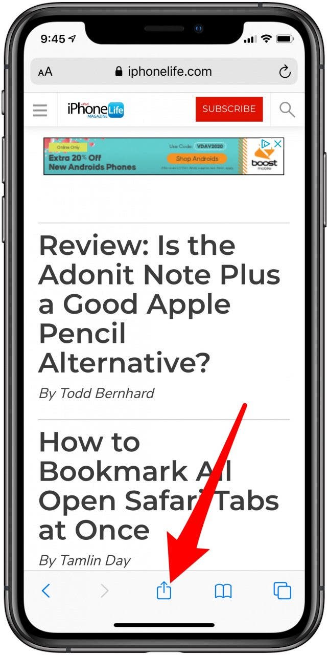 - 在您要搜索的 Safari 页面中,点击分享图标。
