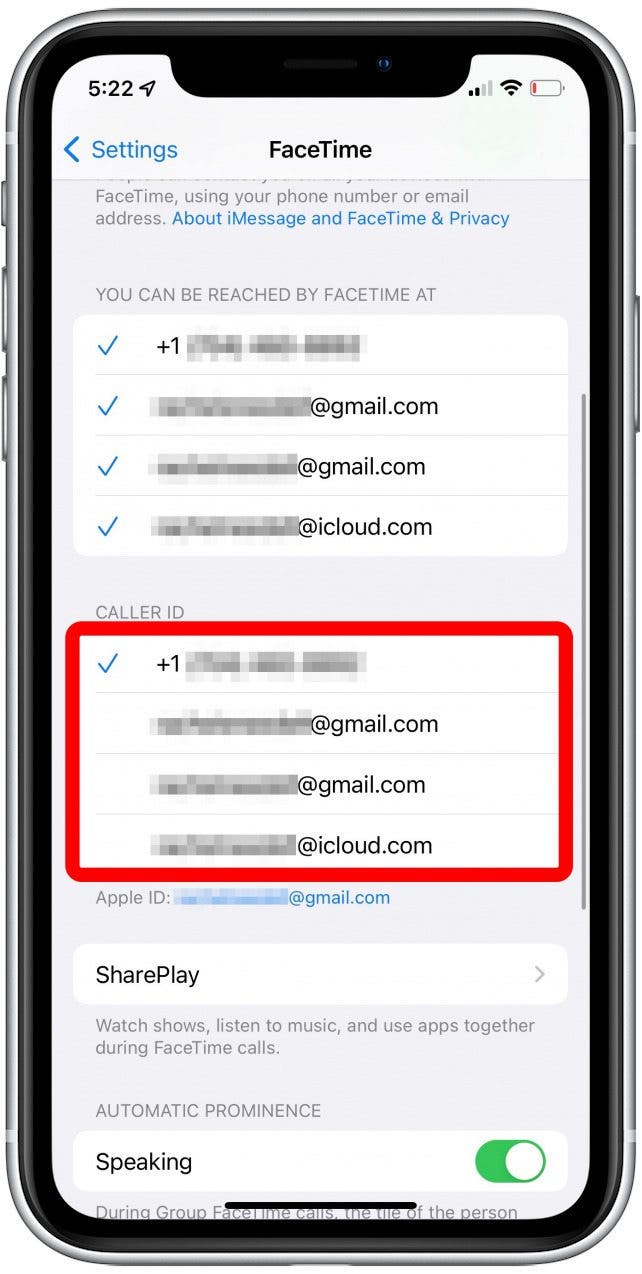 - 您的 FaceTime 来电显示选择可能是您的 Apple ID 电子邮件、iPhone 号码和 iCloud 电子邮件。选择您想要使用的一个。