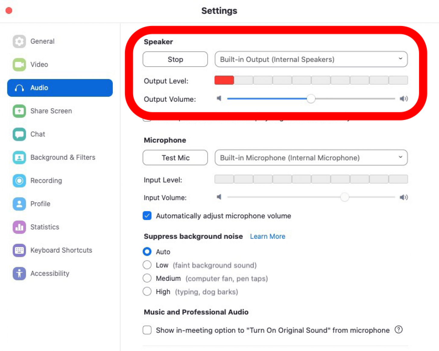 您还可以在 Zoom 应用程序中进行麦克风测试和扬声器测试。
