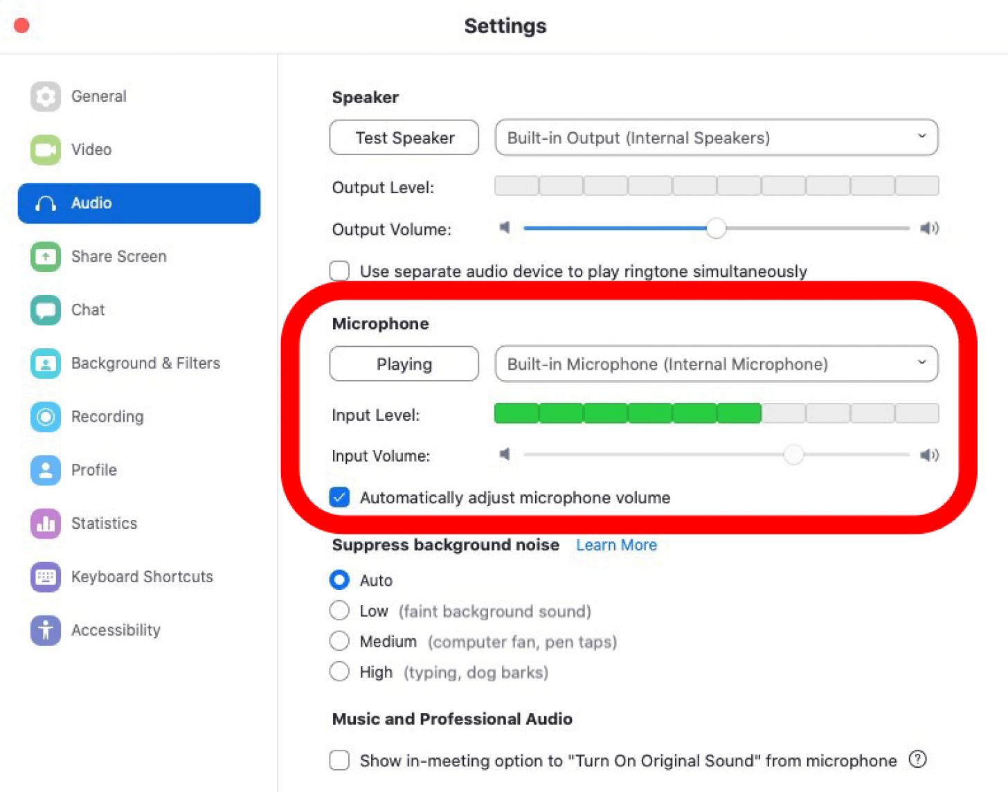 - 说话测试麦克风;您将在屏幕上看到您的输入级别。