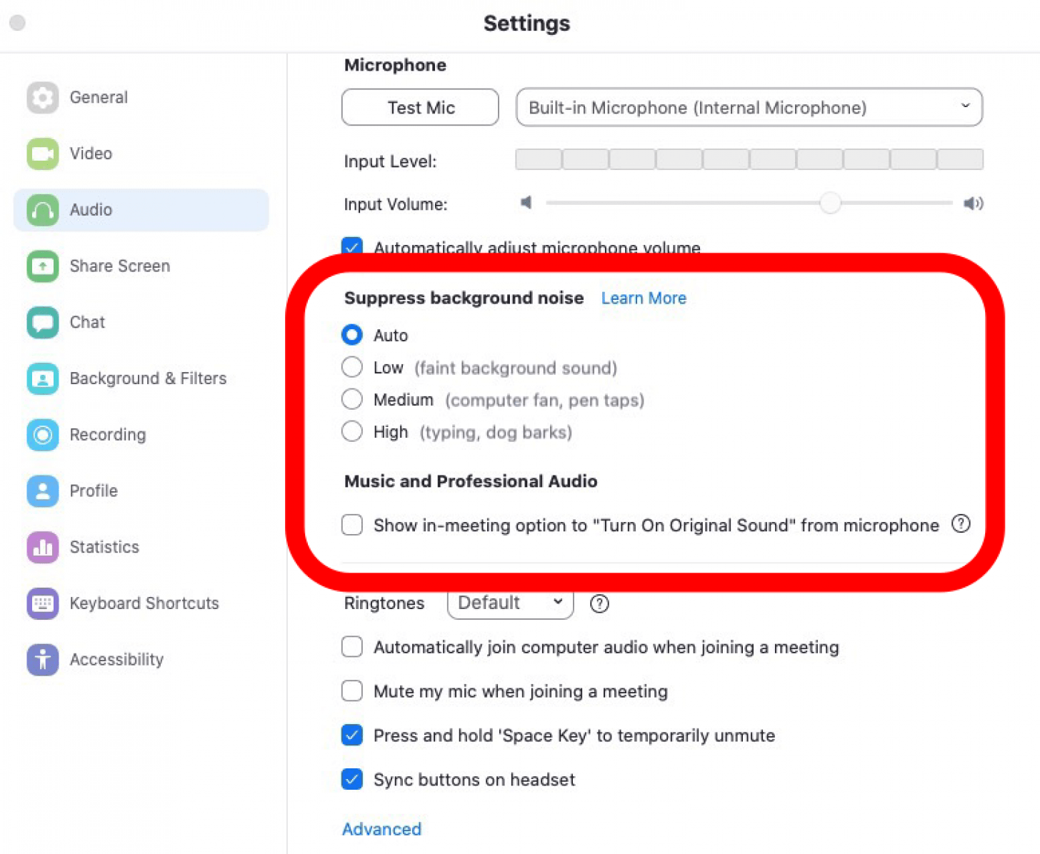 Zoom 还具有可以抑制背景噪音和回声的设置。要访问并打开它们: