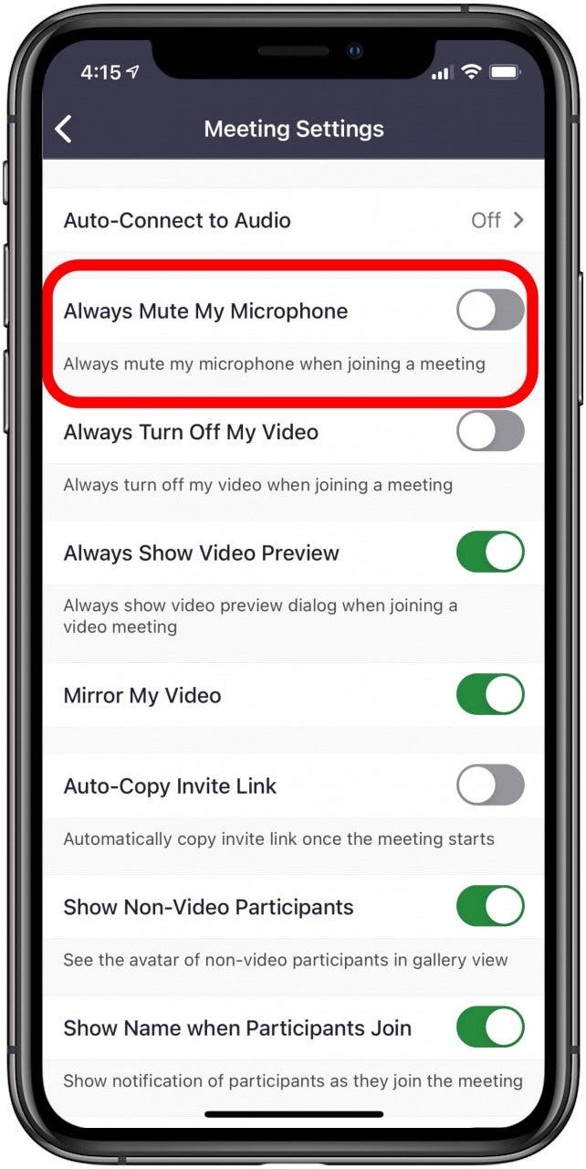 - 确保始终将我的麦克风静音已关闭。当您加入会议时,此设置会使您的麦克风静音,直到您选择打开它,这很容易忘记。