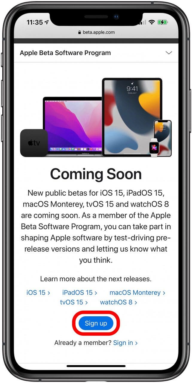 - 如果您还没有注册苹果测试版软件程序,你需要先这样做。轻敲报名。如果您过去已经注册过,请点击登录。