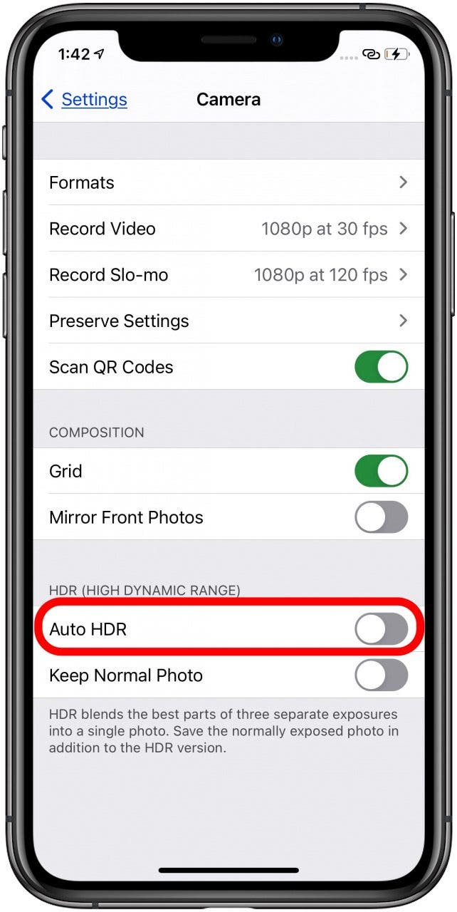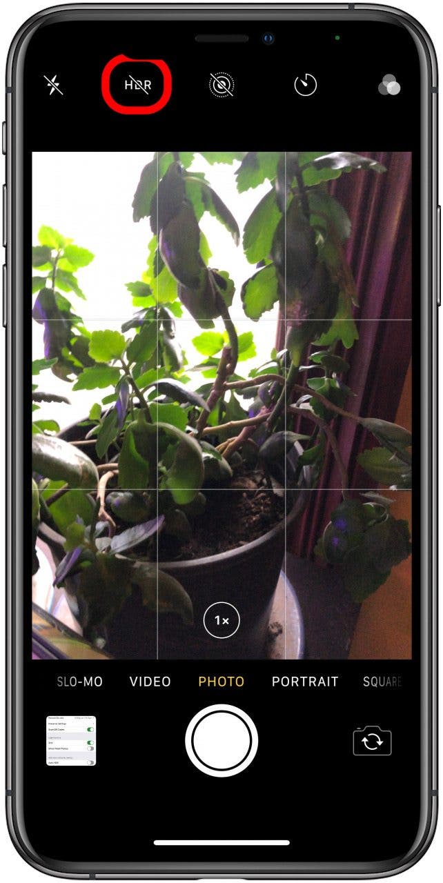 注意:在 iPhone SE(第 2 代)、iPhone 11、iPhone 11 Pro、iPhone XR 和 iPhone XS 上,这将称为智能HDR,并且关闭它的用处不大,因为智能 HDR 不太可能导致运动模糊。 - 现在回到你的相机应用程序。