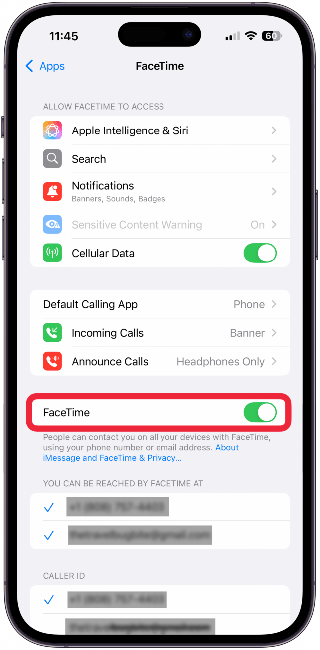 - 如果尚未启用,请点击开关以打开 FaceTime。 (启用后该开关呈绿色。)