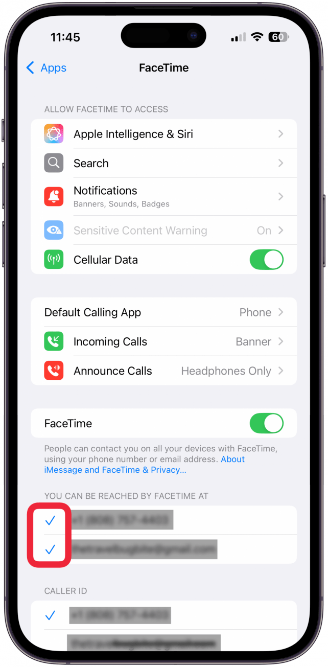 - 如果开关已打开,但您尚未登录,请点按使用您的 Apple ID 进行 FaceTime。系统会要求您使用 Apple ID 登录。确保您的电话号码和与您的 Apple ID 关联的任何电子邮件均已选中,并且旁边有蓝色复选标记。