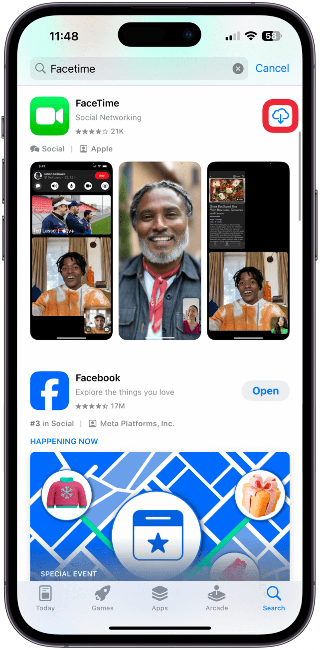 - 搜索 FaceTime 并点击iCloud 图标旁边的应用程序以重新安装它。