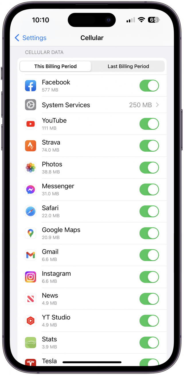 - 确保数据漫游如果您想启用它,则打开(绿色);如果您想禁用它,则关闭(灰色)。