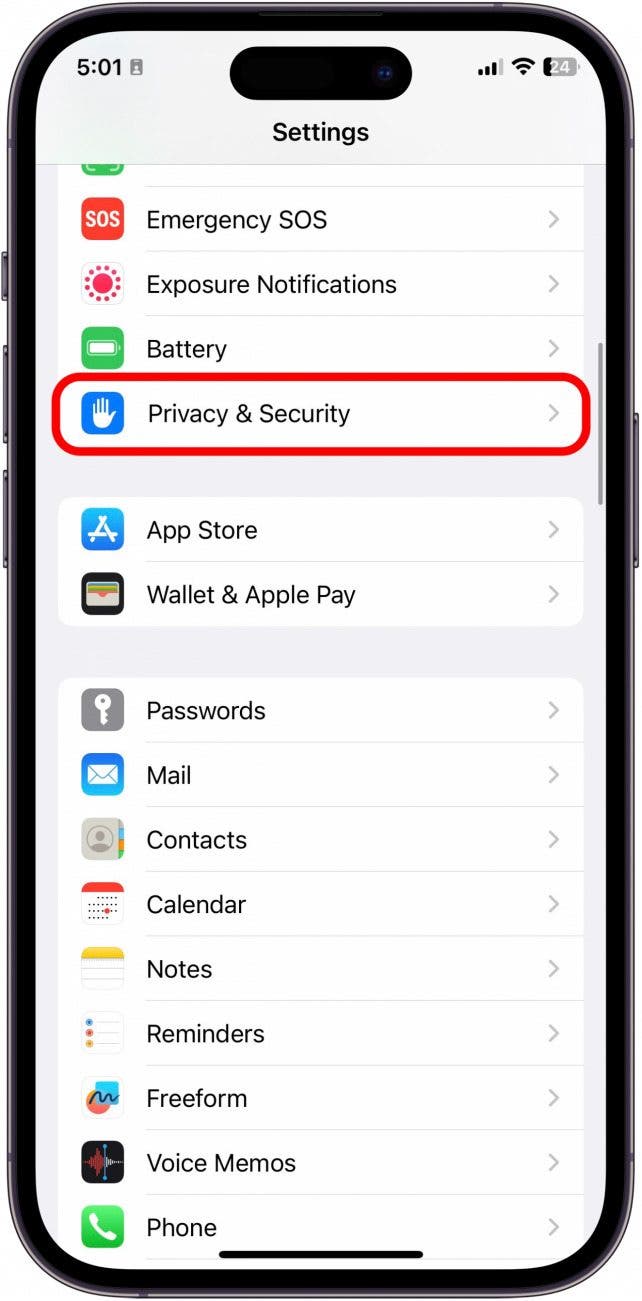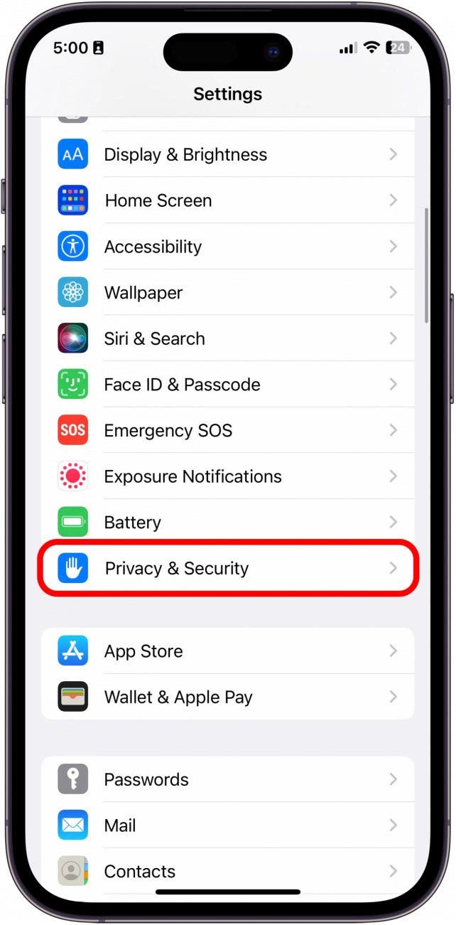 - 现在,再次返回“设置”并重新打开隐私与安全。