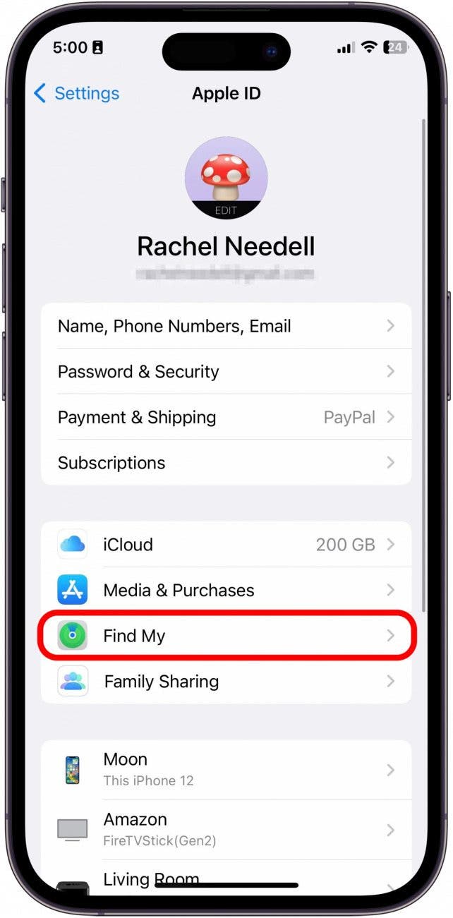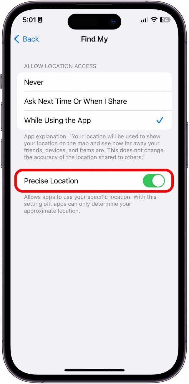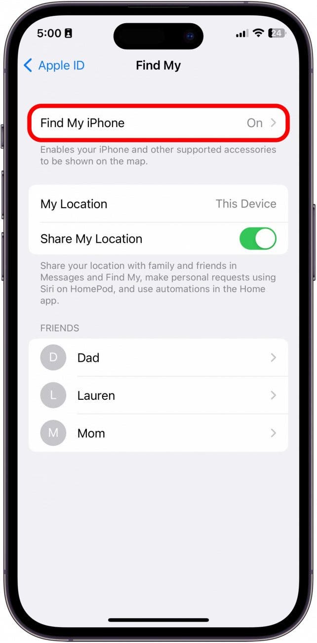 - 切换查找我的 iPhone在。启用后它将呈绿色。