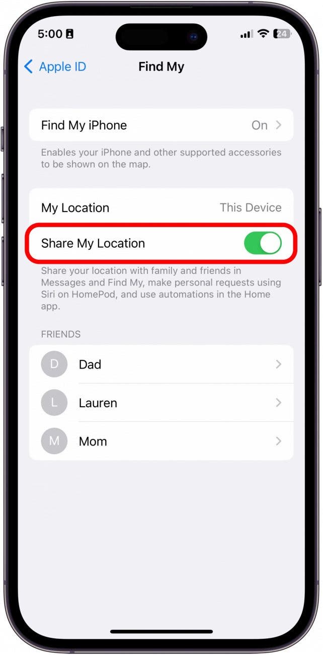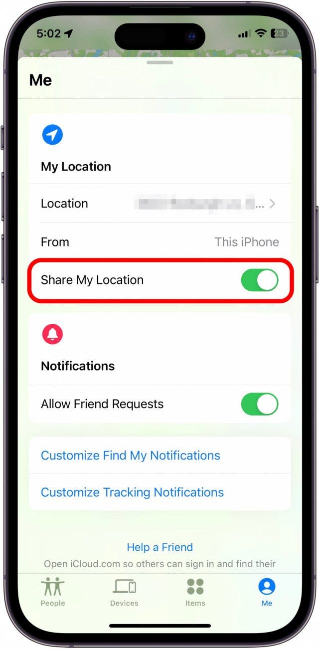 - 切换分享我的位置在。启用后它将呈绿色且位于右侧。