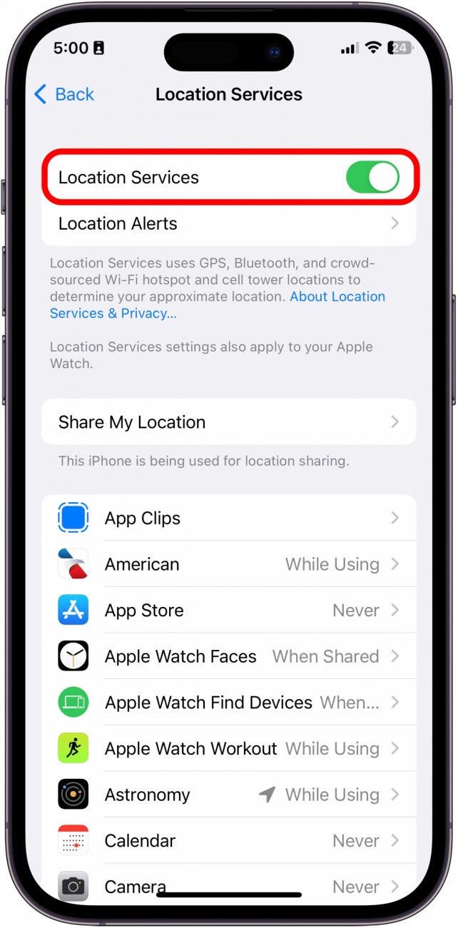 - 切换定位服务在。启用后它将呈绿色且位于右侧。