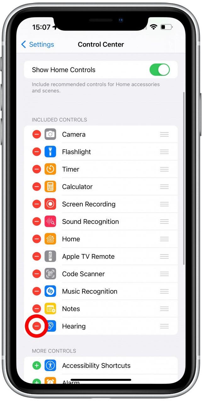 要完全禁用实时收听,只需从控制中心删除听力即可。按照上一节中的步骤操作,但选择第四步中的减号图标将其删除。如果您在控制中心中没有看到“听力”,则说明此功能已被禁用。