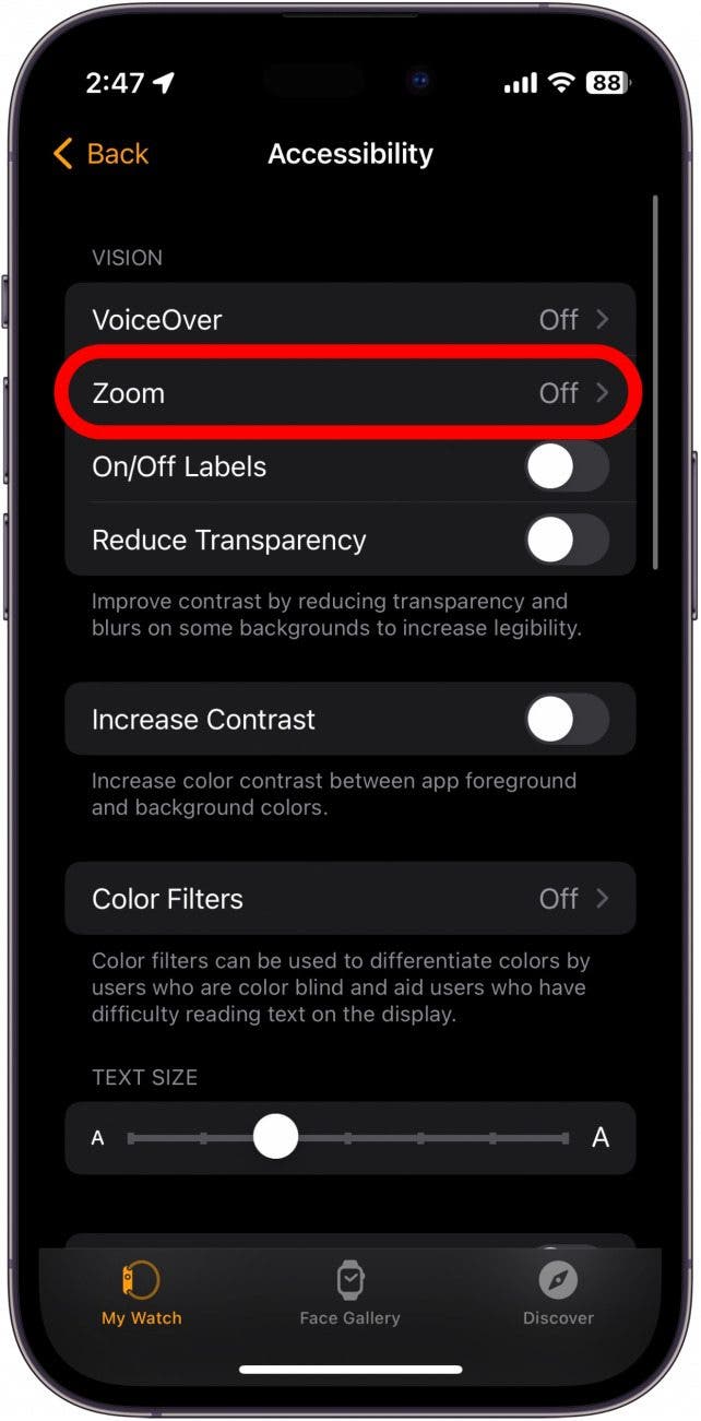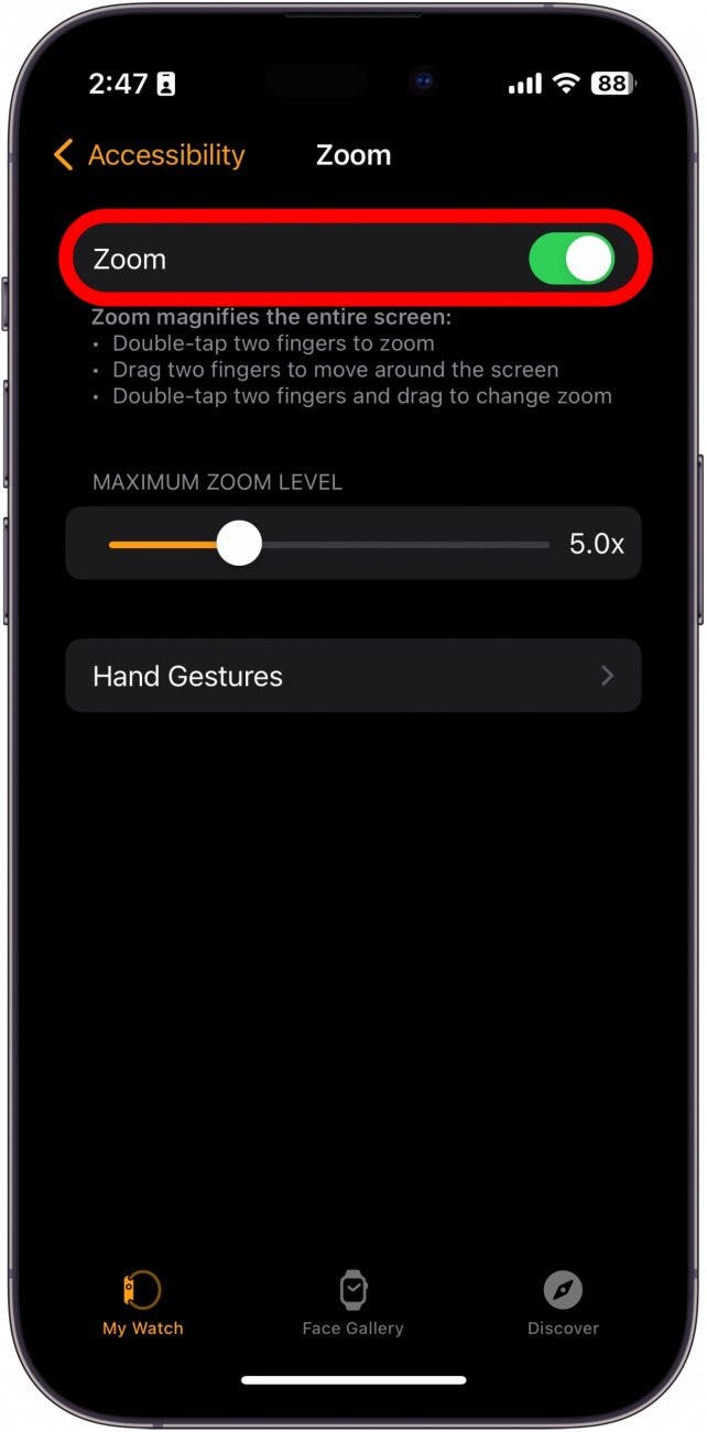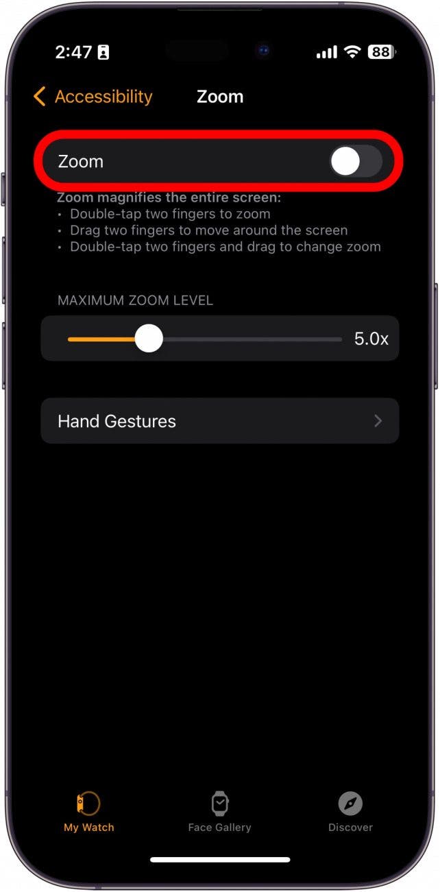 - 如何阻止 Apple Watch 放大?确保禁用“缩放”辅助功能设置,以防止 Apple Watch 在您不希望的情况下放大。