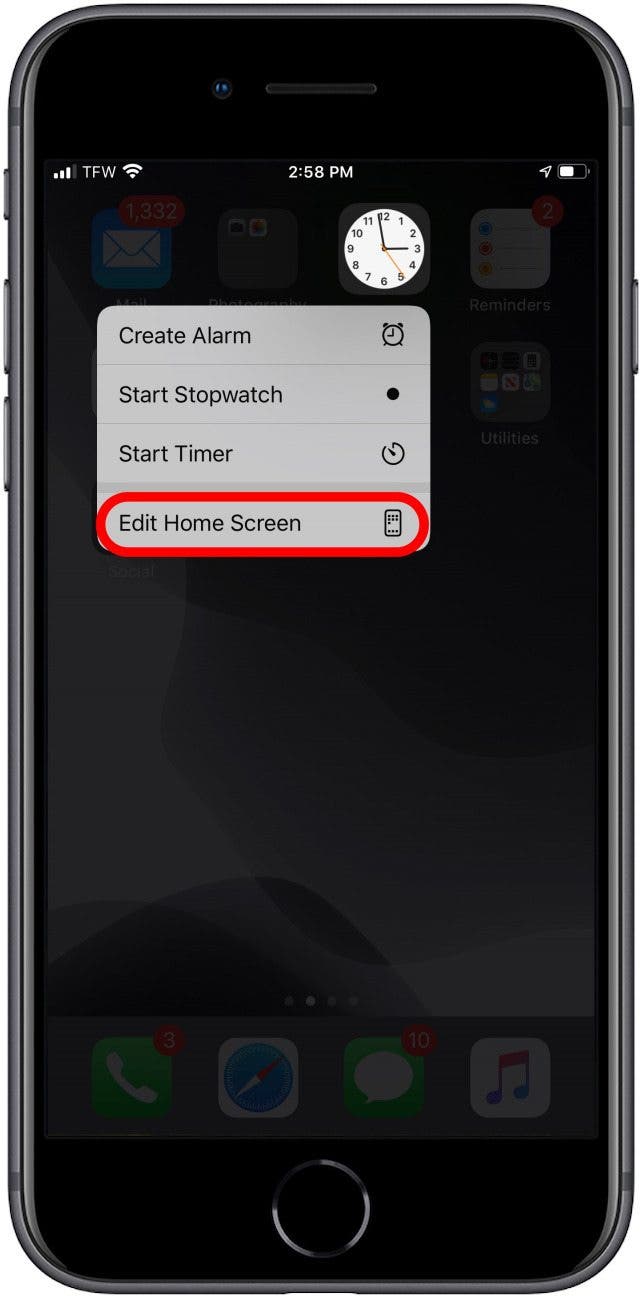 - 點擊並按住任何應用程序圖標。當彈出操作菜單時,選擇編輯主屏幕進入“擺動模式”。