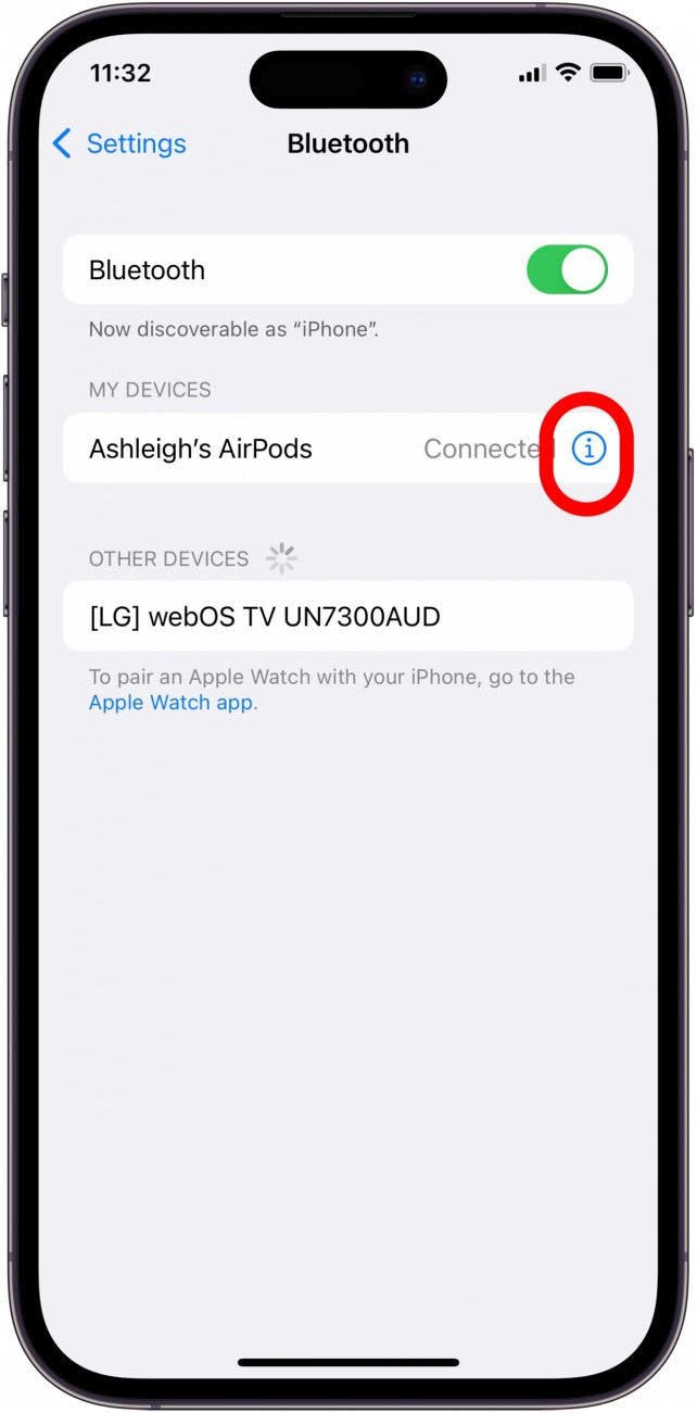 - 在配對設備列表中找到您的 AirPods,然後點擊信息圖標向右。