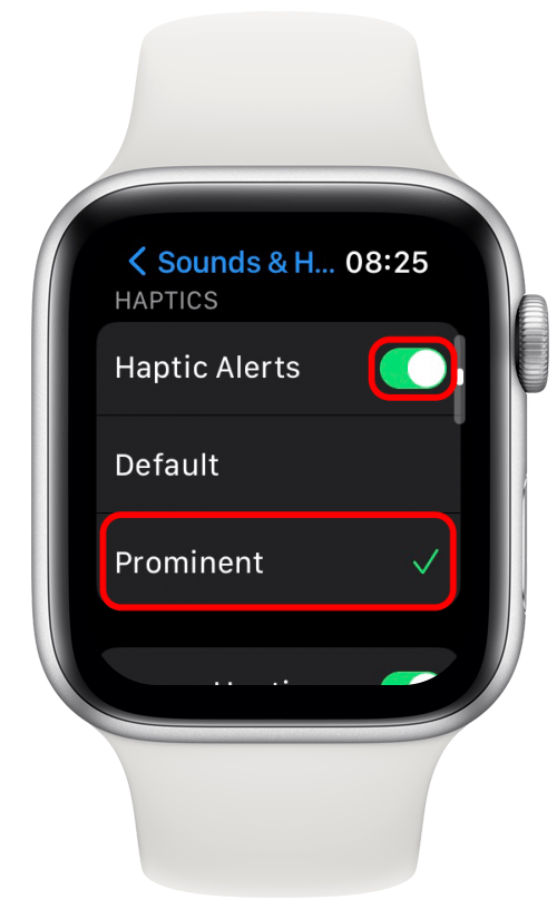 - 繼續向下滾動到觸覺。觸覺是您在手腕上感受到的振動。如果您通過以下方式設置鬧鐘,您可以自定義警報的觸覺。您在設置中所做的更改將影響您的所有觸覺,而不僅僅是與鬧鐘相關的觸覺。我喜歡將它們打開(綠色)並選擇著名的使觸覺更強大。您可以點擊“默認”和“突出”來感受差異。