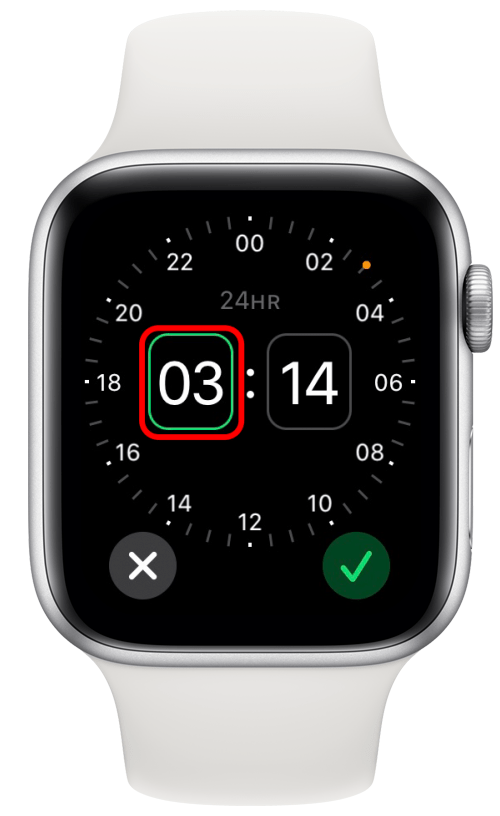 - 在幾個小時左右,您會看到一個綠色的方塊。使用表冠調整小時。向上滾動表示增加,向下滾動表示減少。