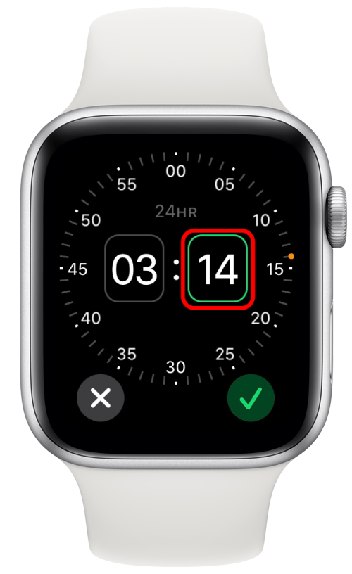 - 接下來點擊分鐘;你會看到他們周圍的綠色方塊。使用表冠調整分鐘。向上滾動表示增加,向下滾動表示減少。