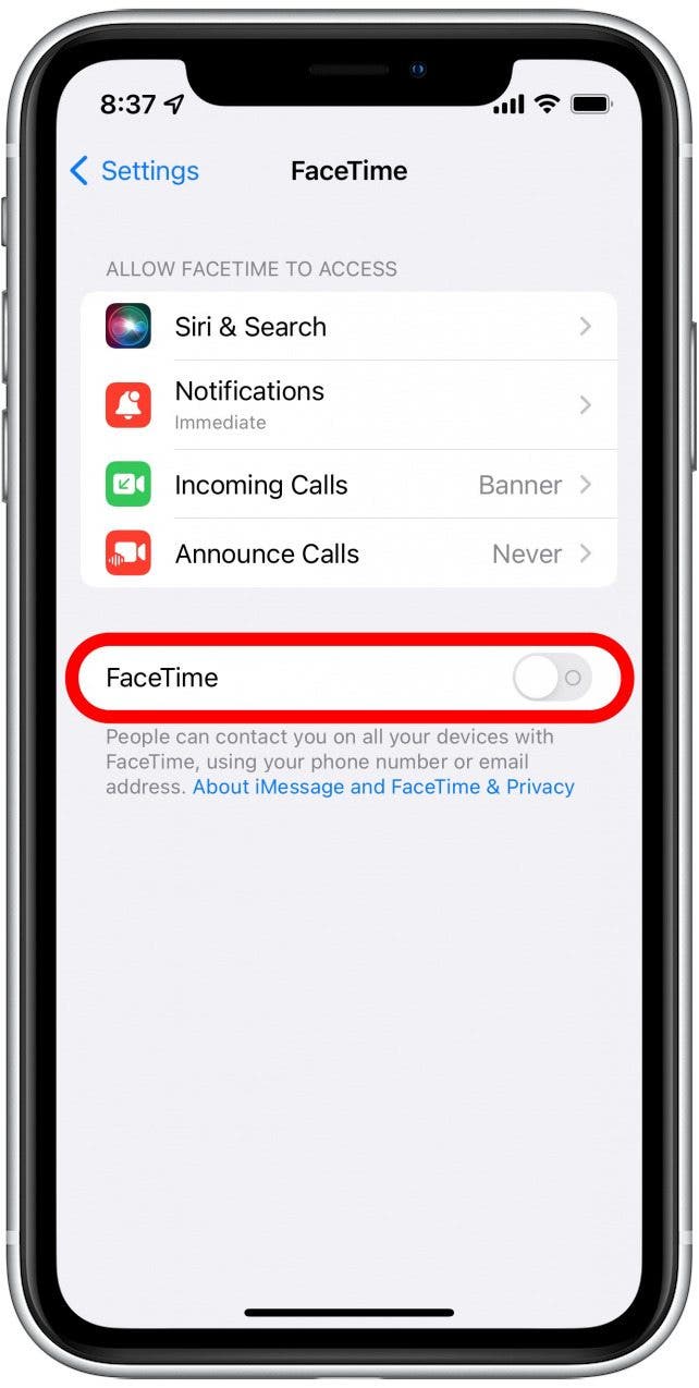 - 點擊以啟用FaceTime 切換。 (啟用後該開關呈綠色。)