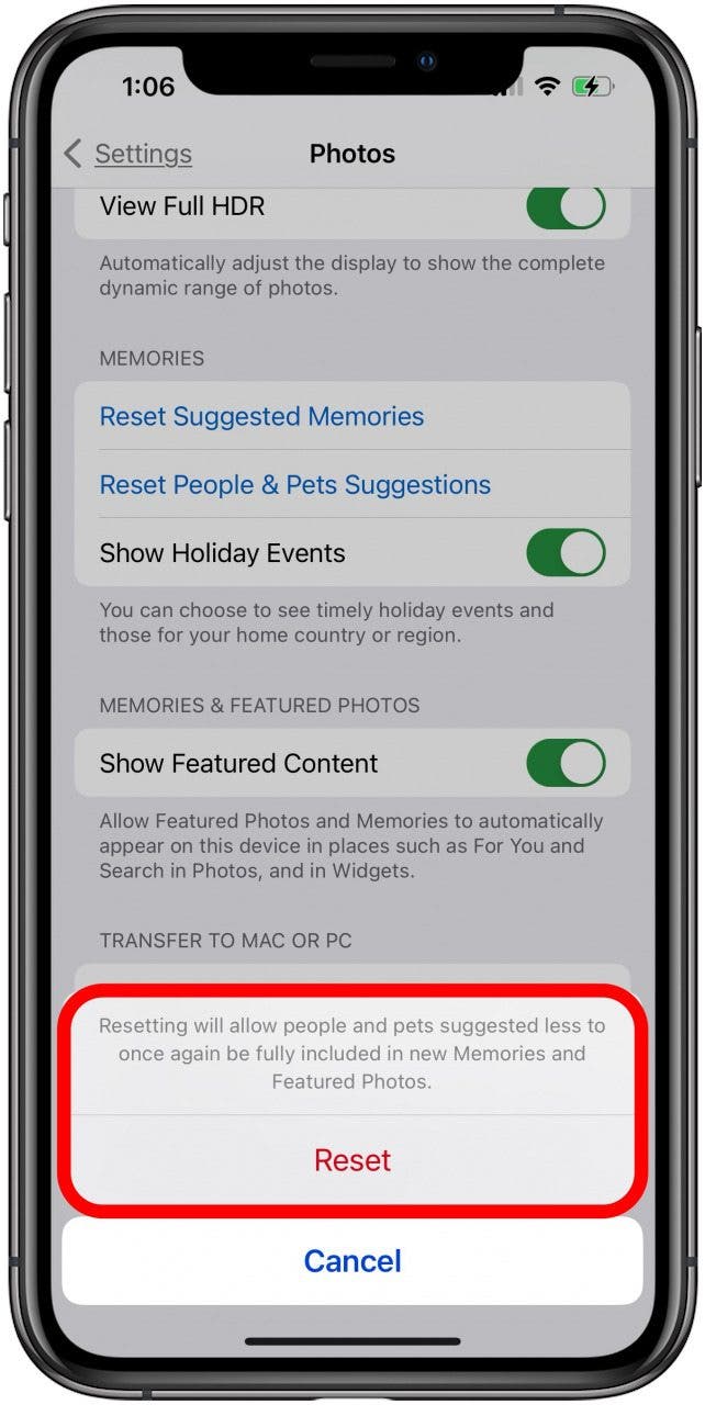 如果上述兩個修復不起作用,您可以重置“人物與寵物”相冊。這將再次開始索引過程,因此您需要重新開始等待。但是,如果在第一次索引嘗試期間出現問題,這應該可以解決問題。