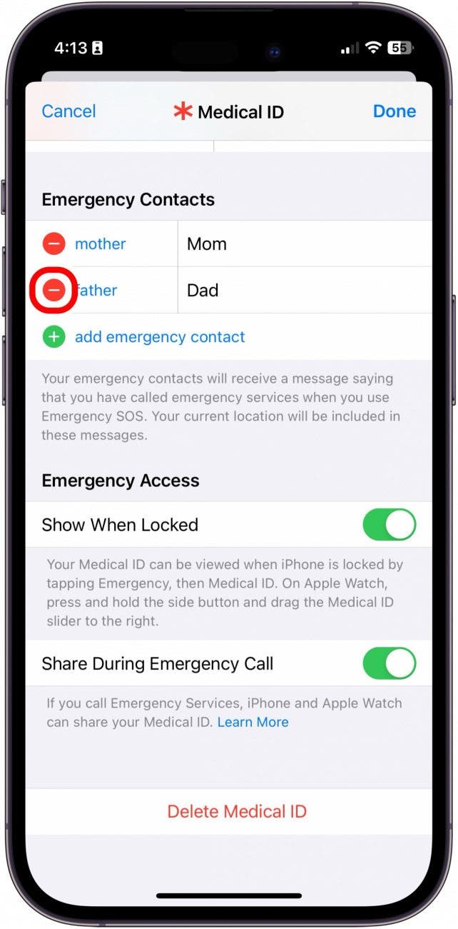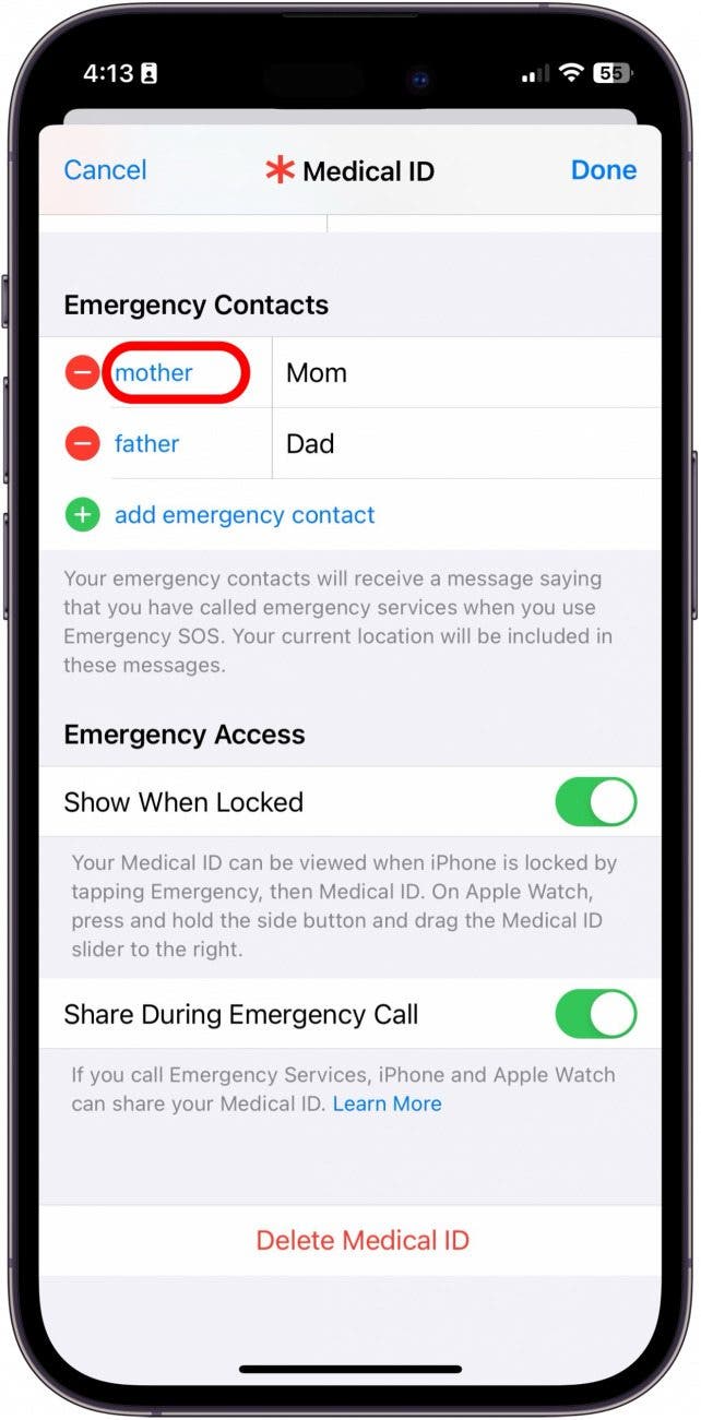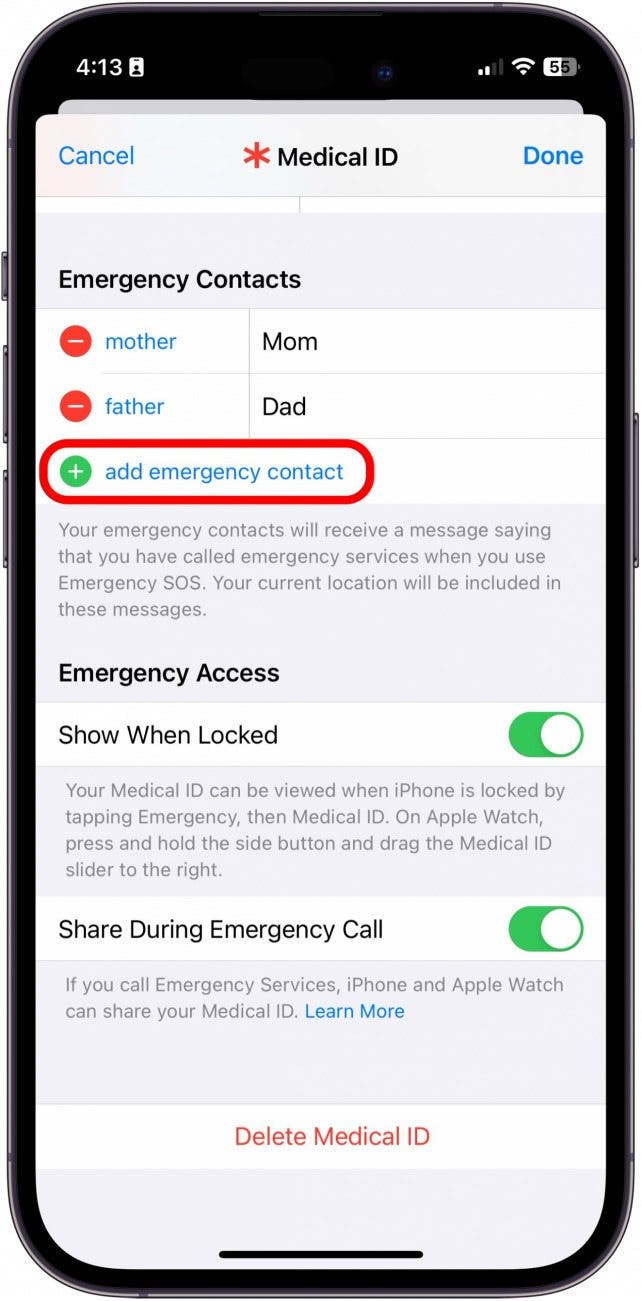 一旦你學會了,您最終可能需要更新該資訊。如果您想要更改緊急聯絡人的頭銜、新增其他緊急聯絡人或刪除舊的緊急聯絡人,您可以透過前往「健康」應用程式來執行此操作。您可以前往「設定」查看緊急聯絡人列表,但只能在「健康」應用程式中編輯和更新資訊。