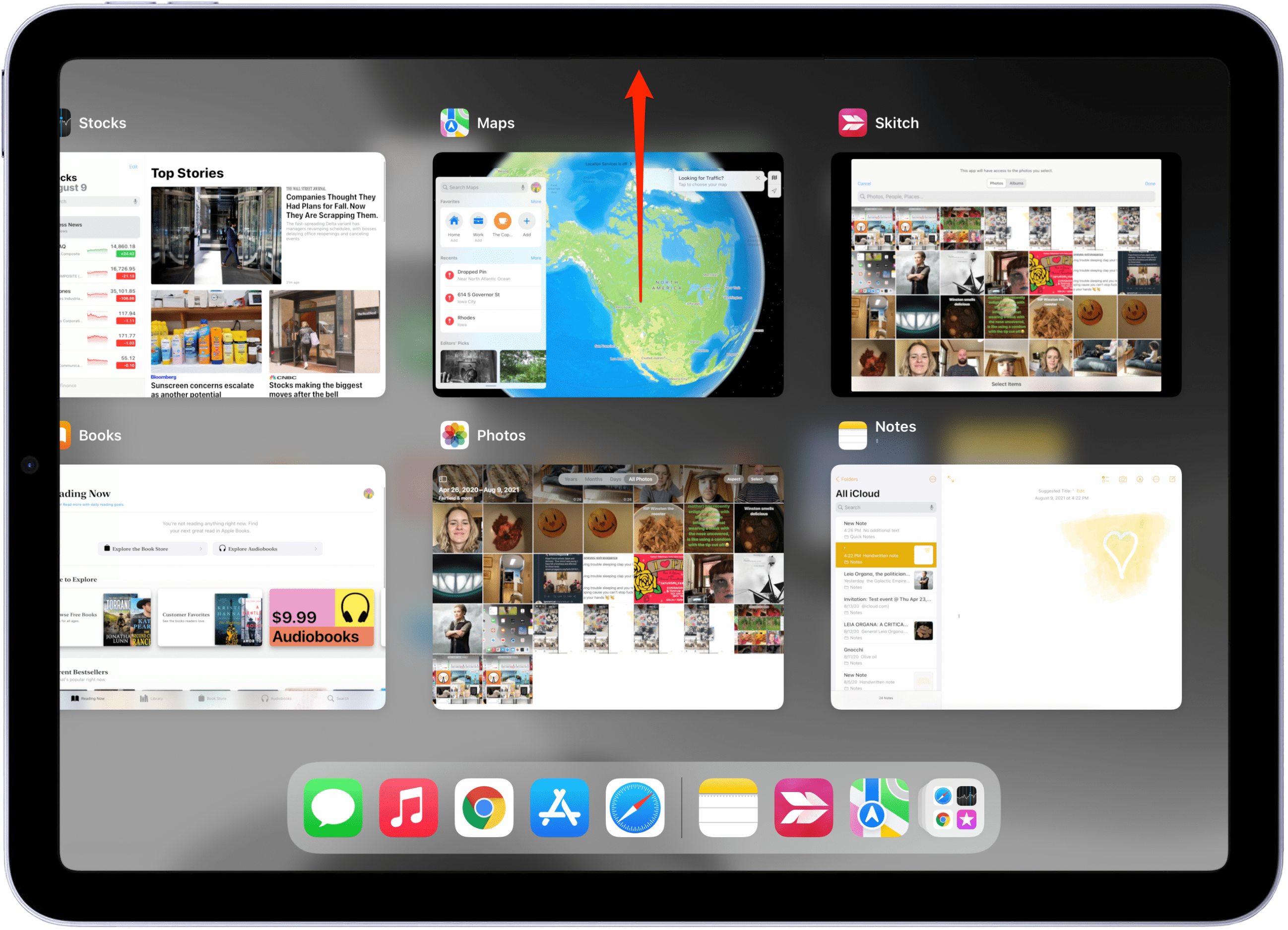 - 您還可以向上滑動應用程序窗口以將其關閉並阻止其在後台運行。這也適用於關閉分割視圖窗口並返回全屏模式。