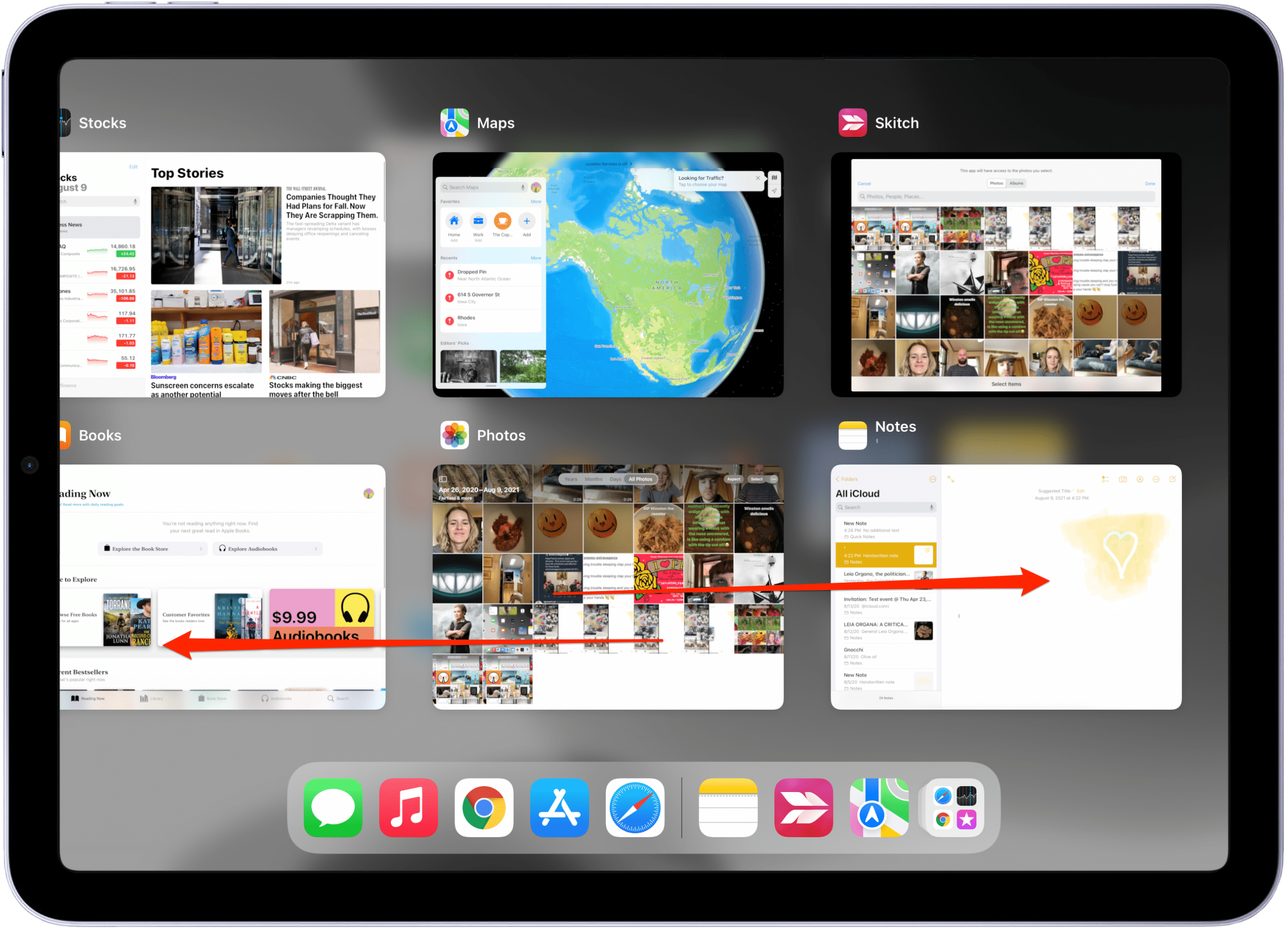 - 要打開應用程序切換器,只需向上滑動從屏幕底部到中心並按住手指直到出現應用程序切換器(帶有主頁按鈕的 iPad 仍然可以通過按主頁按鈕兩次)。