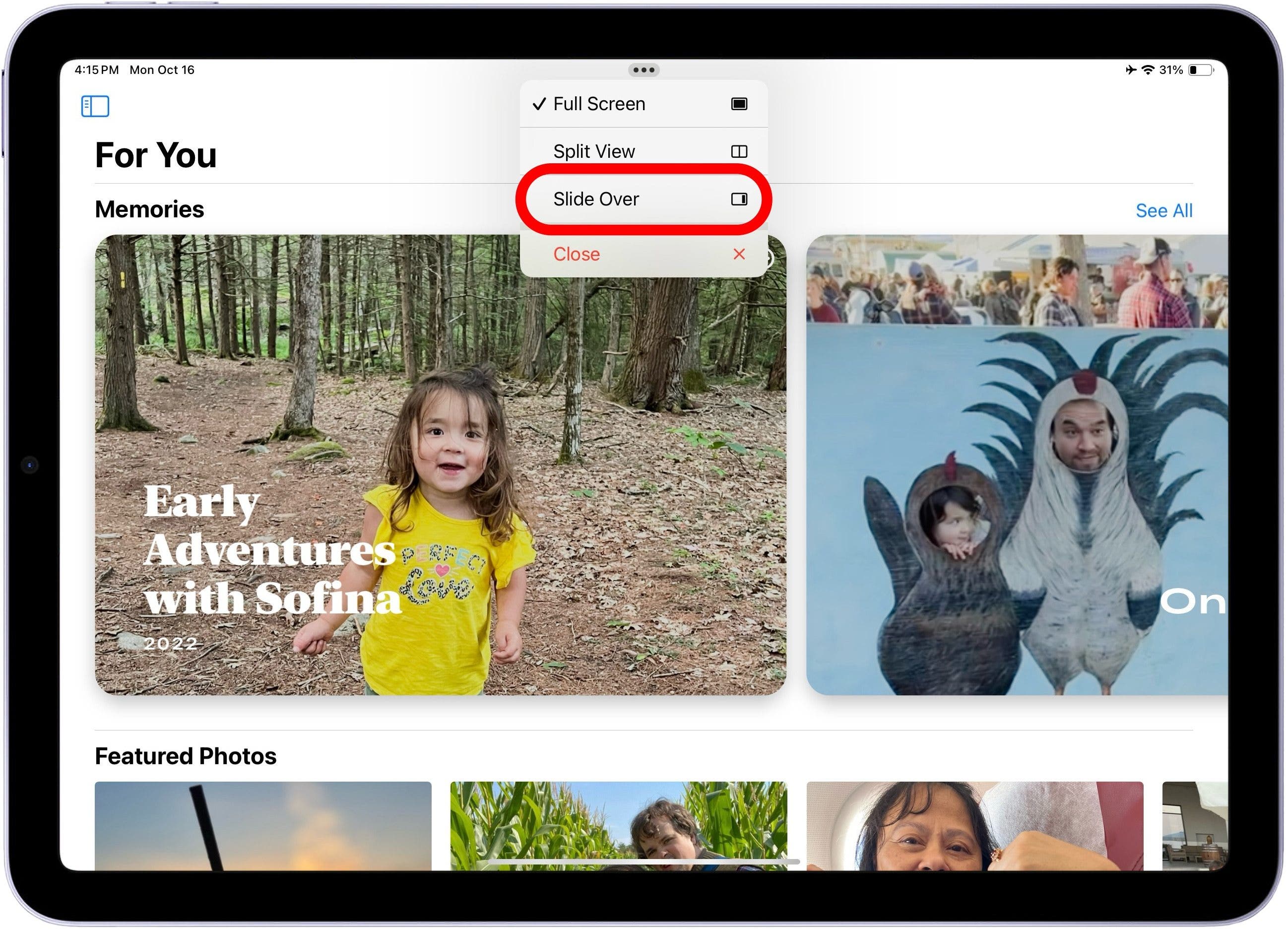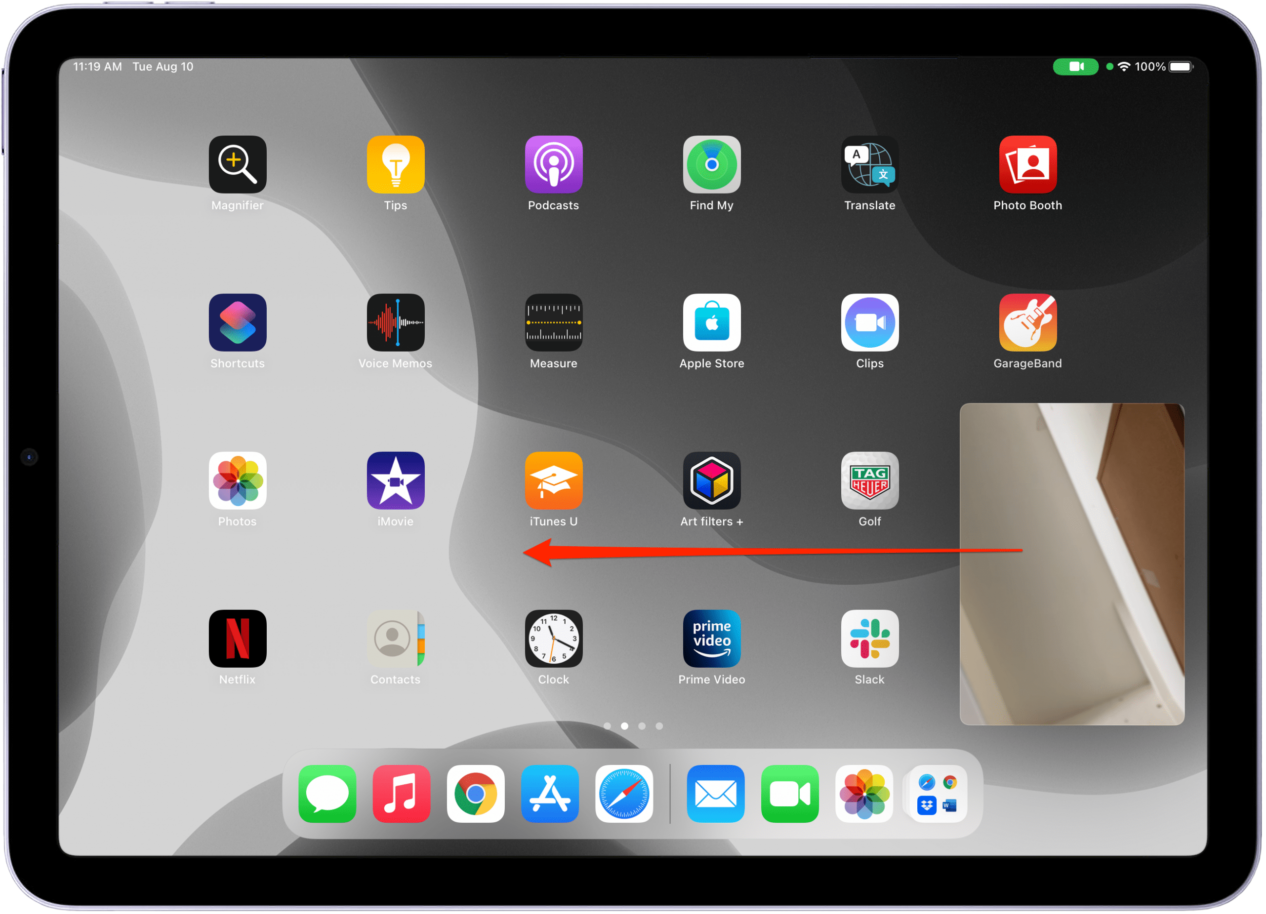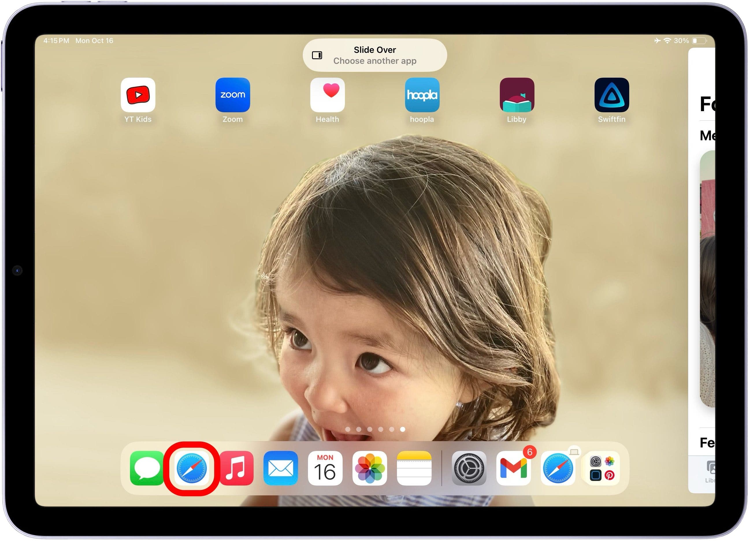 iPad 上的“滑動”功能允許您在已使用的應用程序之上打開第二個應用程序。第二個應用程序將覆蓋 iPad 屏幕的大約三分之一。如需更多精彩的生產力教程,請查看我們的免費教程。要打開“幻燈片”: