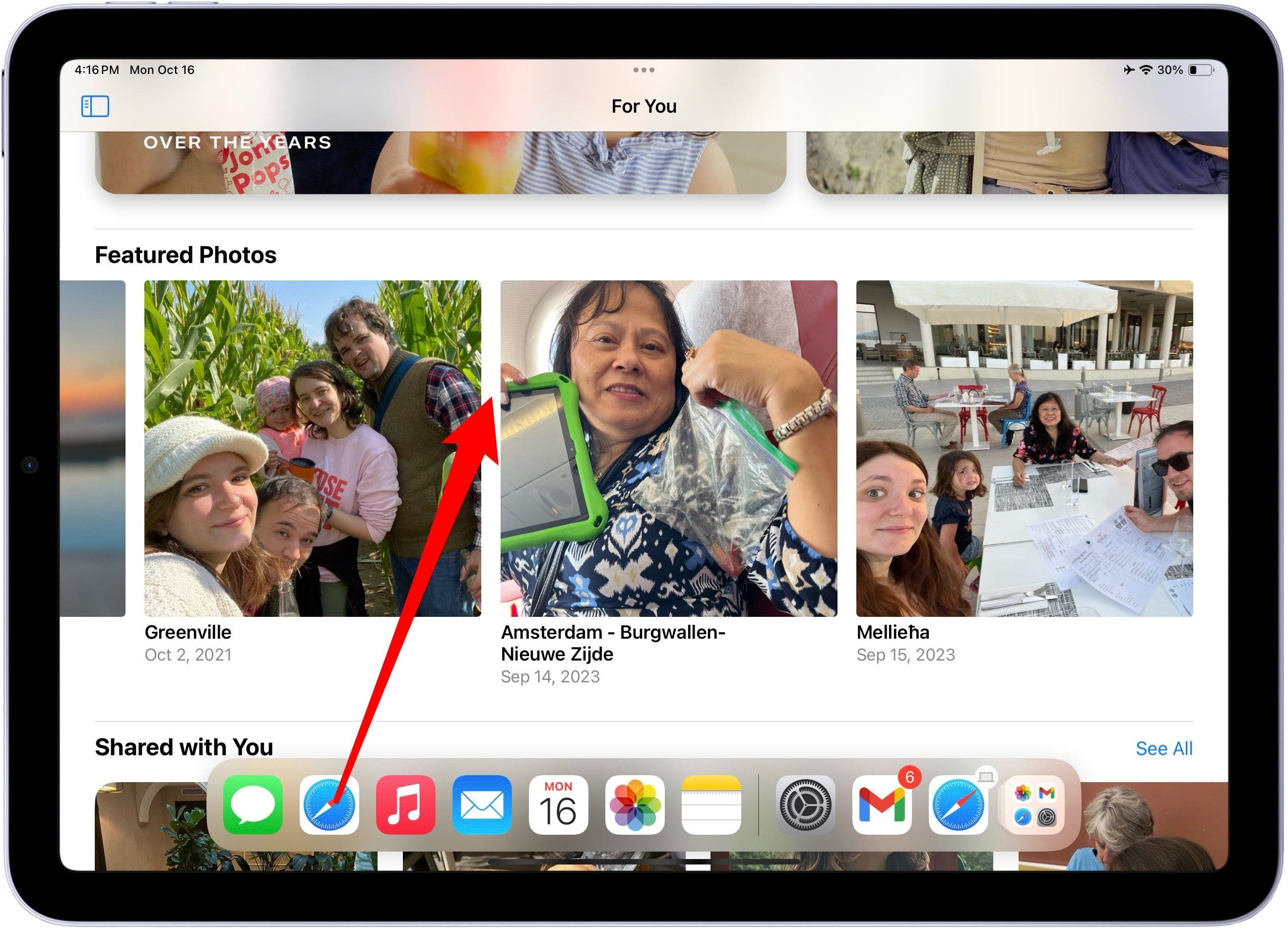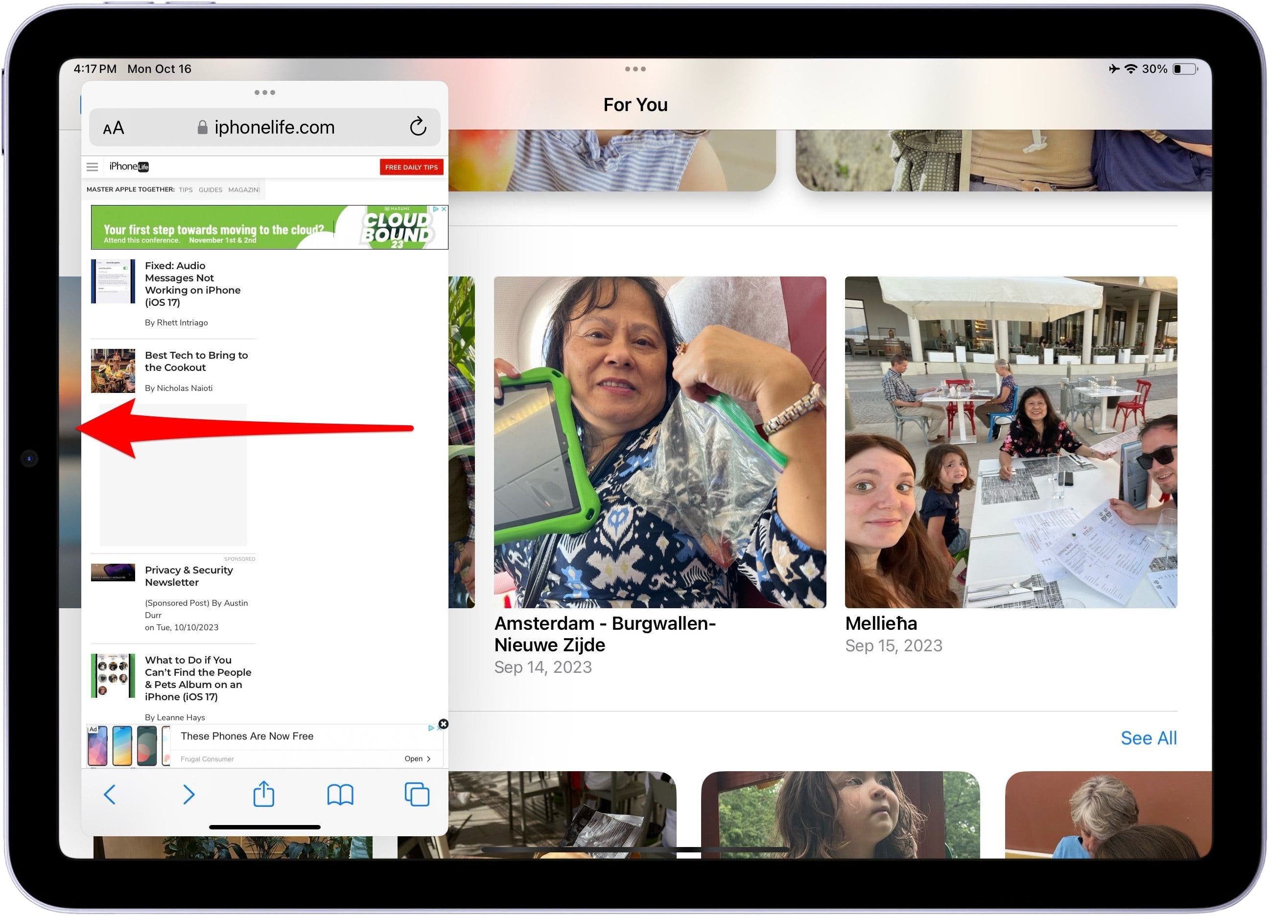 另一個基本的 iPad 多任務工具是拖放。這使您可以跳過將一段內容共享到另一個應用程序的過程。相反,您可以將文件、照片、應用程序、文本選擇和提醒從一個應用程序拖放到另一個應用程序中。在 iPad 拆分視圖中使用拖放是最簡單的,但您也可以在幻燈片中使用它。要使用 iPad 拖放功能: