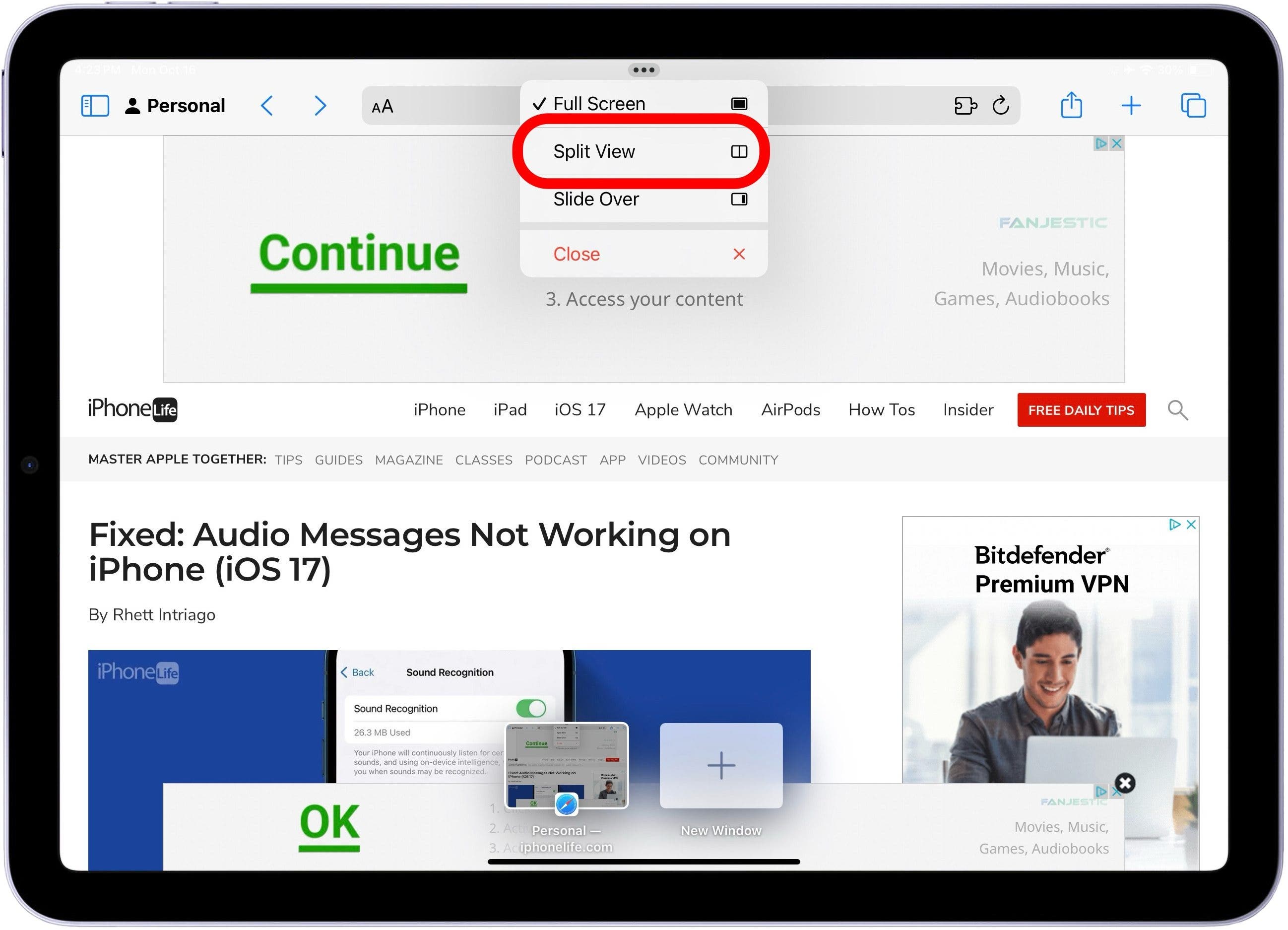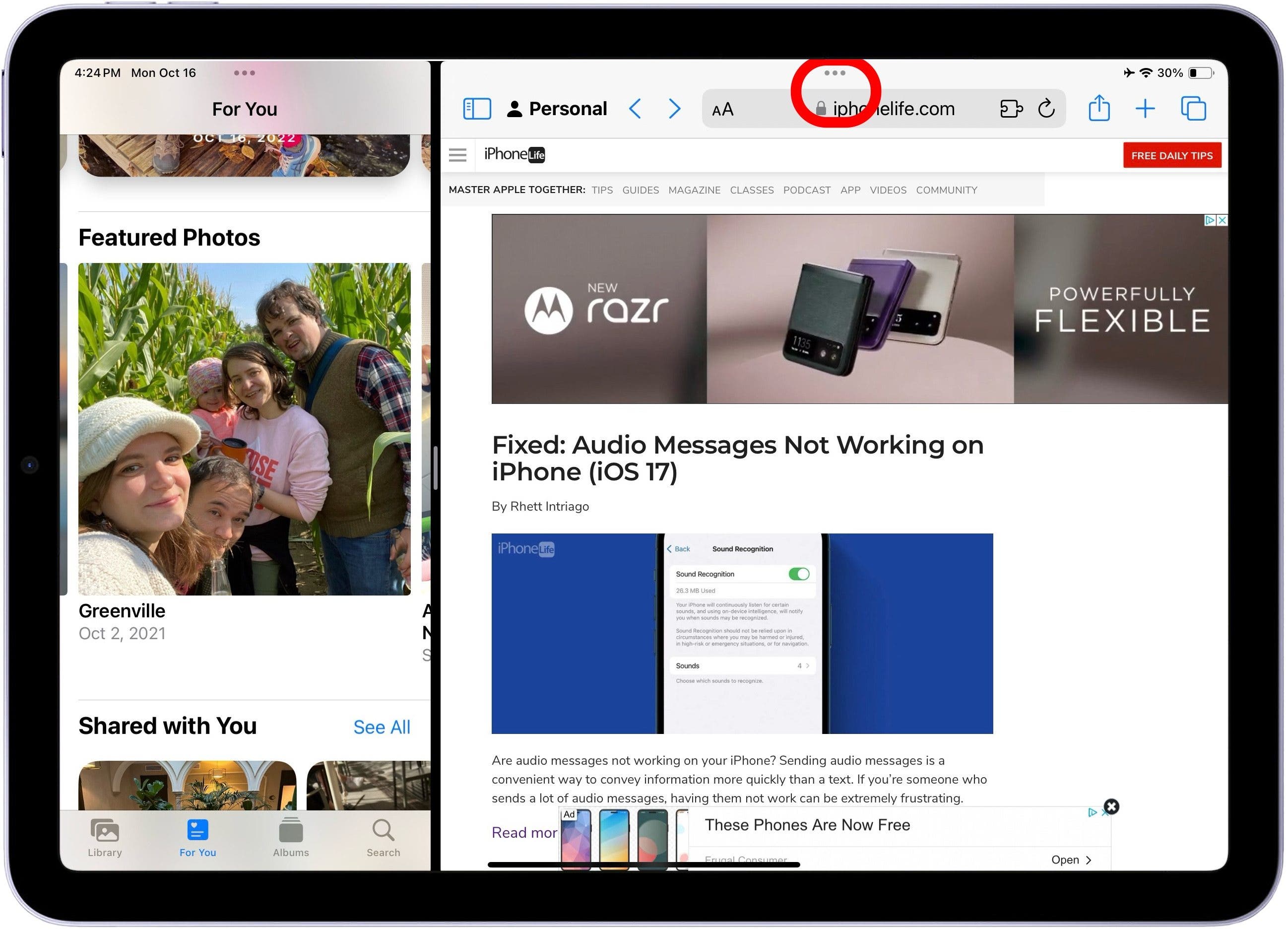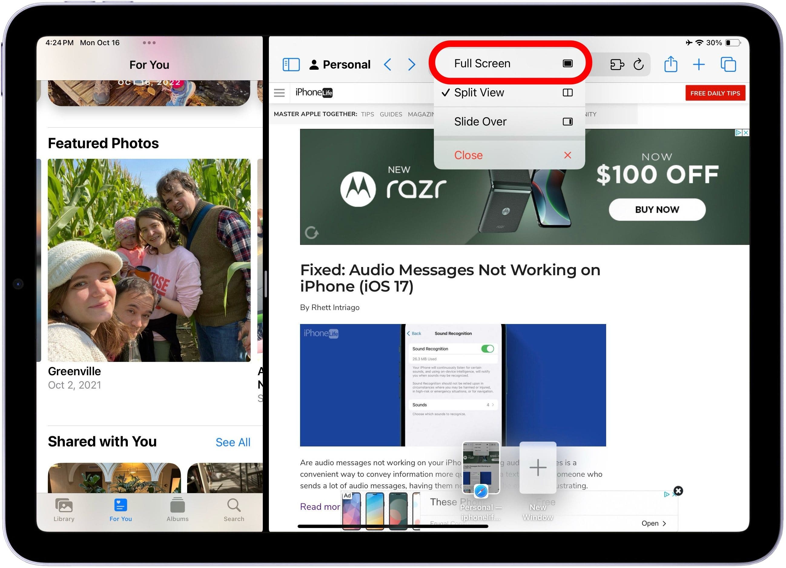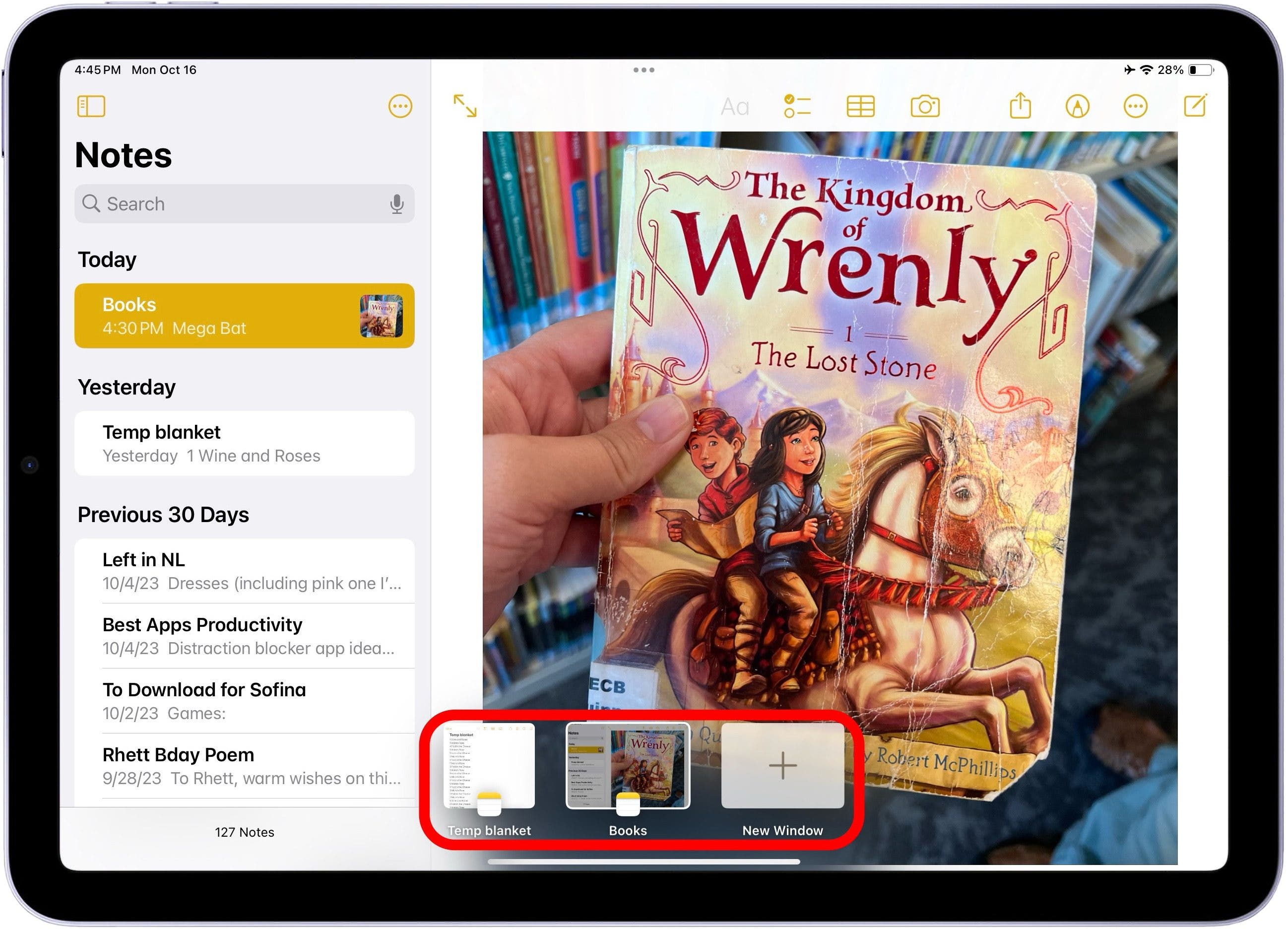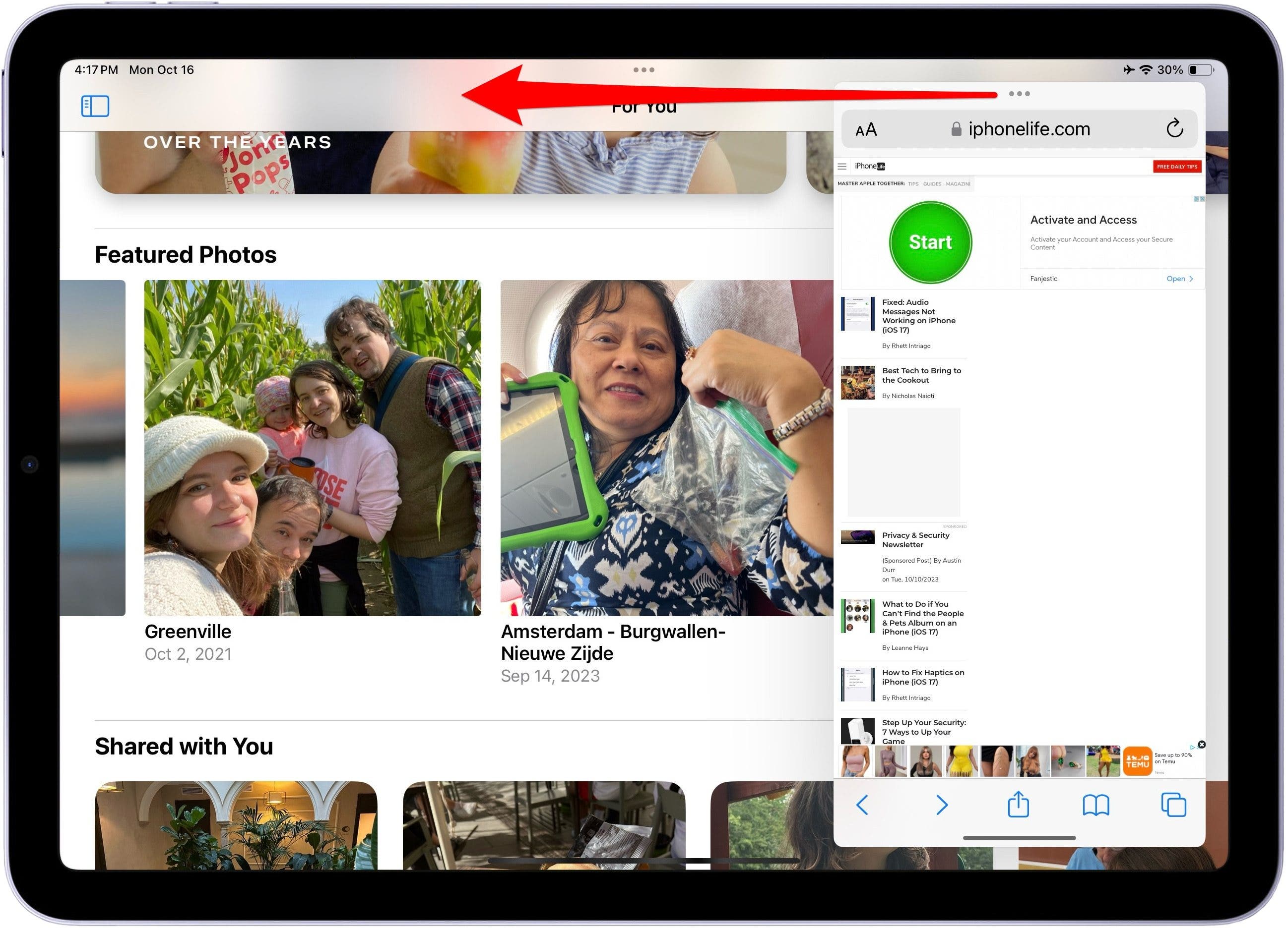 分屏(分屏視圖)允許您同時在兩個不同的應用程序中工作。您可以分割屏幕並在兩側放置一個應用程序,或者讓一個應用程序佔據屏幕的三分之一。是您甚至可以在拆分視圖中從同一個應用程序打開兩個窗口;這樣您就可以同時處理兩個筆記、組織兩個不同的相冊等等。此外,並非每個應用程序都可以使用分屏視圖(尤其是第三方應用程序),但它可以使用本機 Apple 應用程序。多任務菜單使打開和關閉分割視圖變得比以往更容易。操作方法如下: